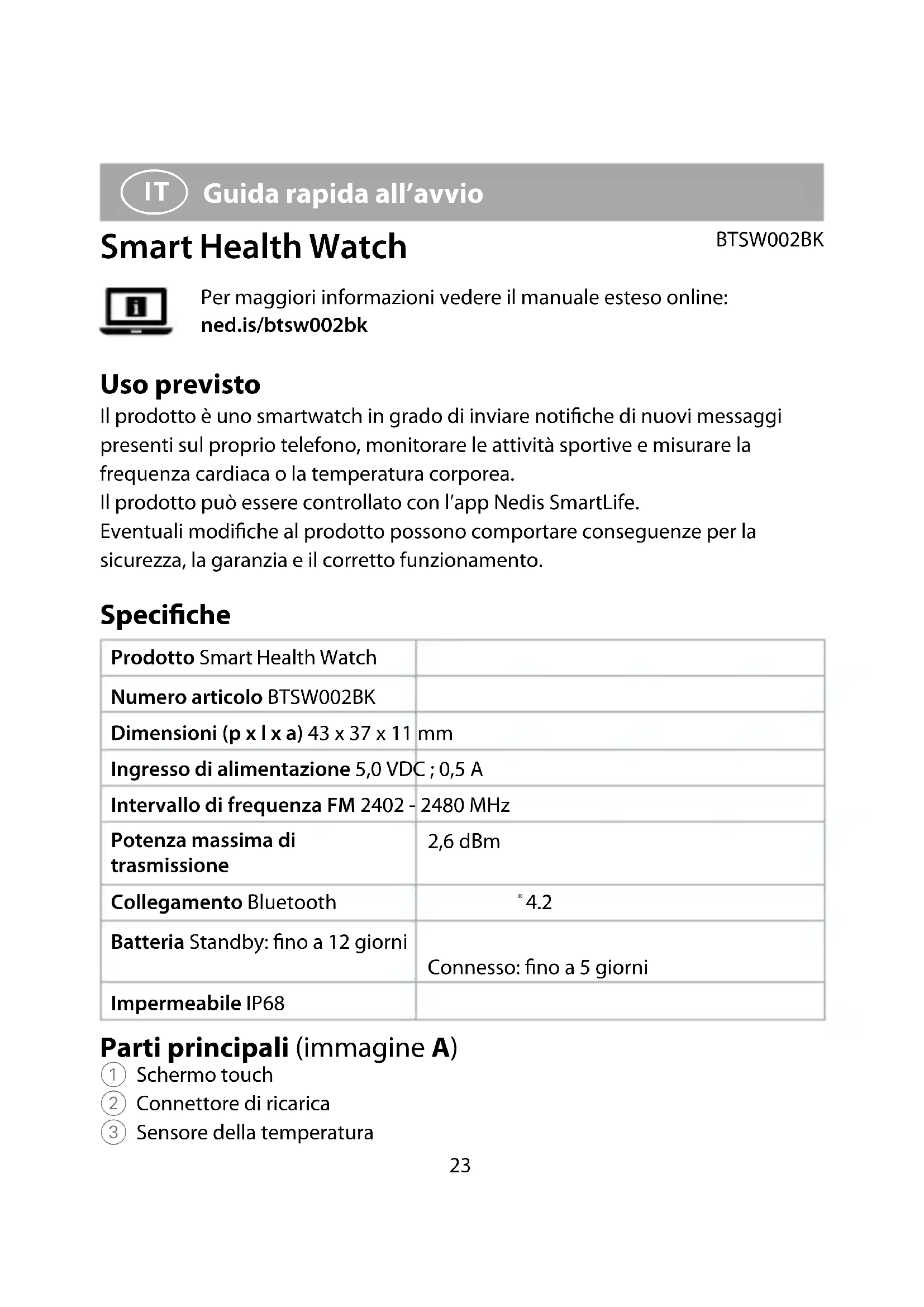 Guida rapida all’avvio Smart Health Watch BTSW002BK Per maggiori informazioni vedere il manuale esteso online: ned.is/btsw002bk Uso previsto Il prodotto è uno smartwatch in grado di inviare notiche di nuovi messaggi presenti sul proprio telefono, monitorare le attività sportive e misurare la frequenza cardiaca o la temperatura corporea. Il prodotto può essere controllato con l’app Nedis SmartLife. Eventuali modiche al prodotto possono comportare conseguenze per la sicurezza, la garanzia e il corretto funzionamento. Speciche Prodotto Smart Health Watch Numero articolo BTSW002BK Dimensioni (p x l x a) 43 x 37 x 11 mm Ingresso di alimentazione 5,0 VDC ; 0,5 A Intervallo di frequenza FM 2402 - 2480 MHz Potenza massima di trasmissione 2,6 dBm Collegamento Bluetooth