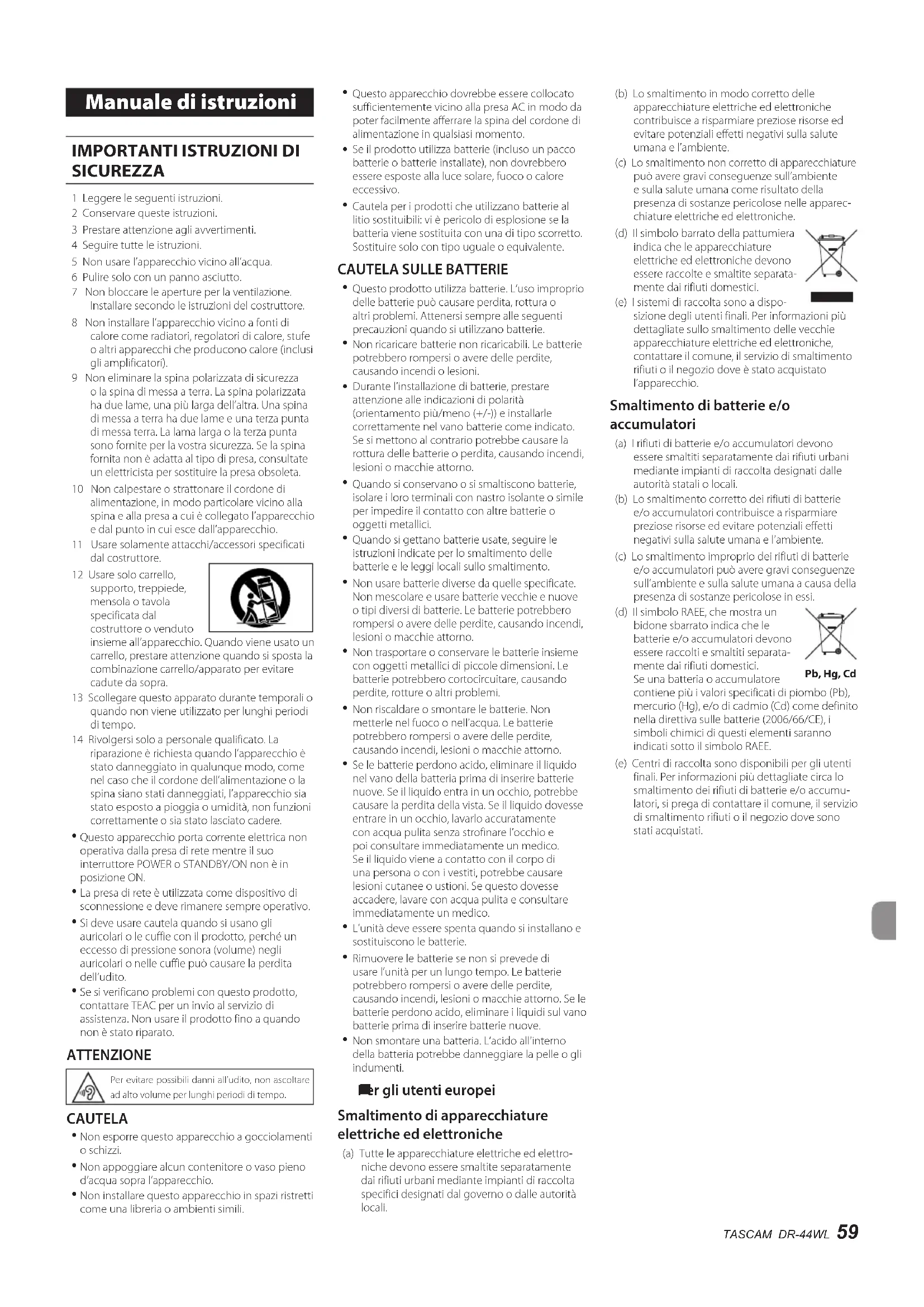 Se si verificano problemi con questo prodotto, contattare TEAC per un invio al servizio di assistenza. Non usare il prodotto fino a quando non è stato riparato. ATTENZIONE Per evitare possibili danni all’udito, non ascoltare ad alto volume per lunghi periodi di tempo. CAUTELA