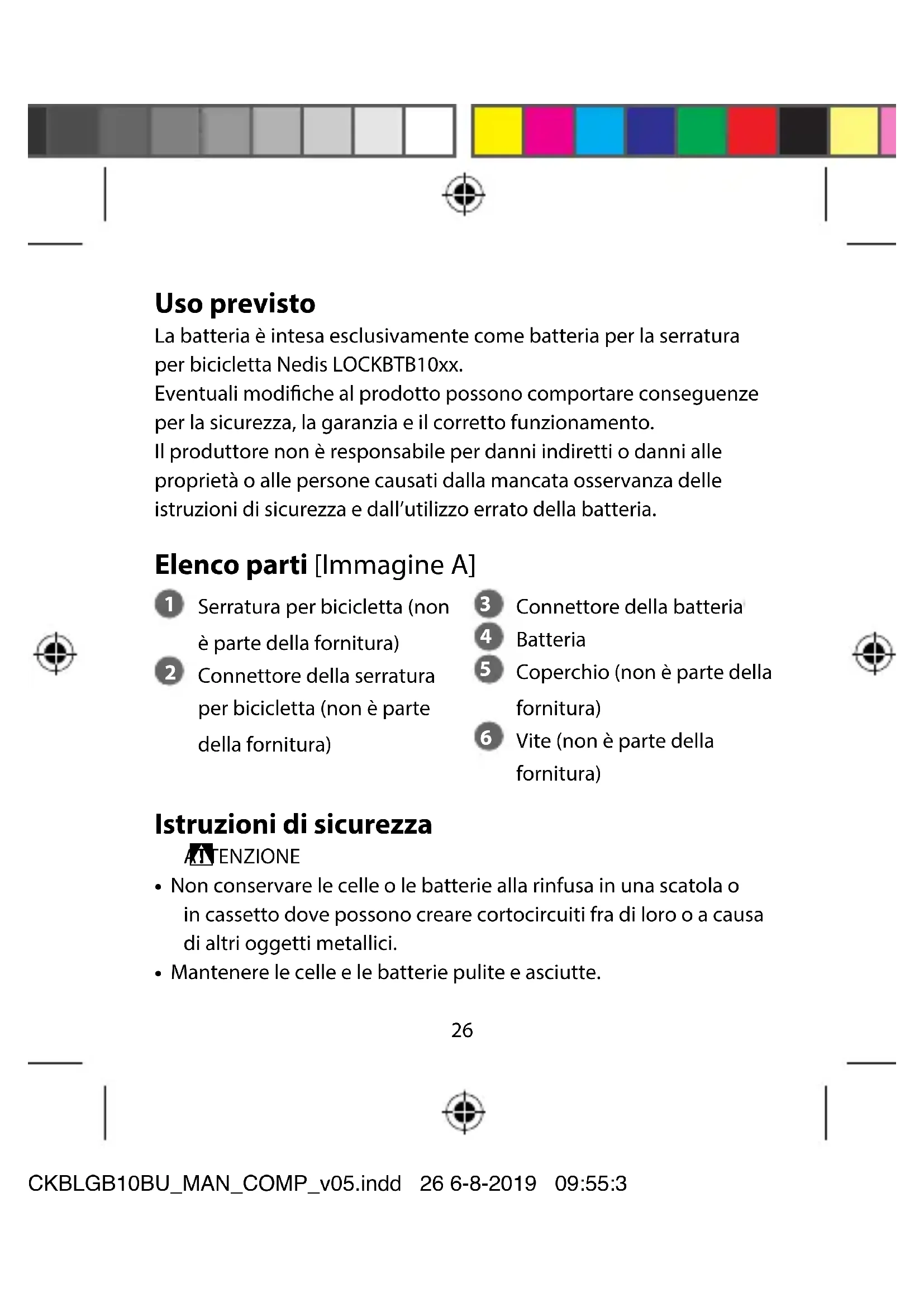 Guida rapida all’avvio Batteria di ricambio LOCKBLGB10BU Per maggiori informazioni vedere il manuale esteso online: ned.is/lockblgb10bu LOCKBLGB10BU_MAN_COMP_v05.indd 25 6-8-2019 09:55:3726 Uso previsto La batteria è intesa esclusivamente come batteria per la serratura per bicicletta Nedis LOCKBTB10xx. Eventuali modiche al prodotto possono comportare conseguenze per la sicurezza, la garanzia e il corretto funzionamento. Il produttore non è responsabile per danni indiretti o danni alle proprietà o alle persone causati dalla mancata osservanza delle istruzioni di sicurezza e dall’utilizzo errato della batteria. Elenco parti [Immagine A]