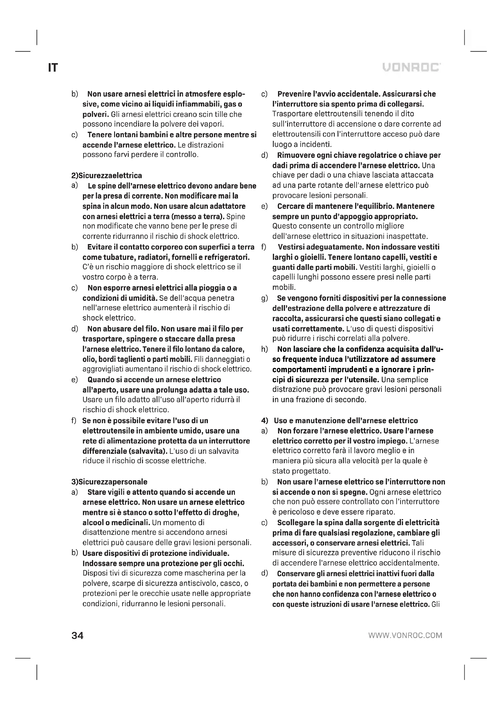 Sono state utilizzate parti di ricambio non originali Ciò costituisce l’unica garanzia espressa o implicita fornita dall’azienda. Non esistono altre garanzie espresse o implicite che si estendono oltre il presente documento, ivi comprese le garanzie im- plicite di commerciabilità e idoneità per uno scopo particolare. In nessun caso VONROC sarà responsa- bile di eventuali danni incidentali o consequenziali. I rimedi dei rivenditori saranno limitati alla ripara- zione o sostituzione di unità o parti non conformi. Il prodotto e il manuale per l’utente sono soggetti a modifiche. I dati tecnici possono essere modificati senza ulteriore notifica.