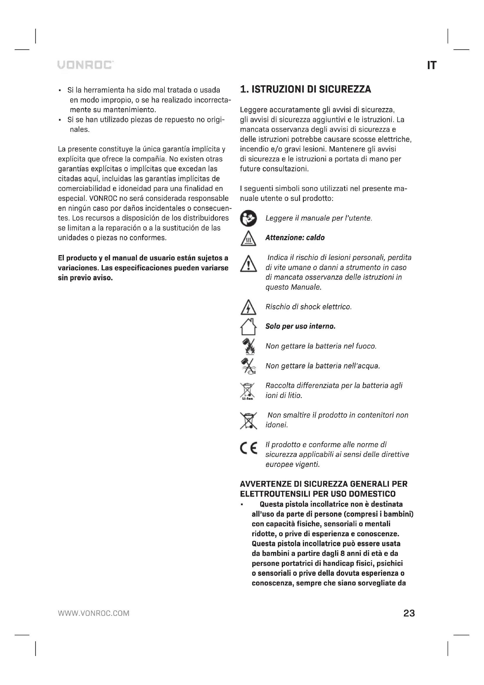 - Sono state utilizzate parti di ricambio non origi- nali Ciò costituisce l’unica garanzia espressa o implicita fornita dall’azienda. Non esistono altre garanzie espresse o implicite che si estendono oltre il presente documento, ivi comprese le garanzie im- plicite di commerciabilità e idoneità per uno scopo particolare. In nessun caso VONROC sarà responsa- bile di eventuali danni incidentali o consequenziali. I rimedi dei rivenditori saranno limitati alla ripara- zione o sostituzione di unità o parti non conformi. Il prodotto e il manuale per l’utente sono soggetti a modifiche. I dati tecnici possono essere modificati senza ulteriore notifica.