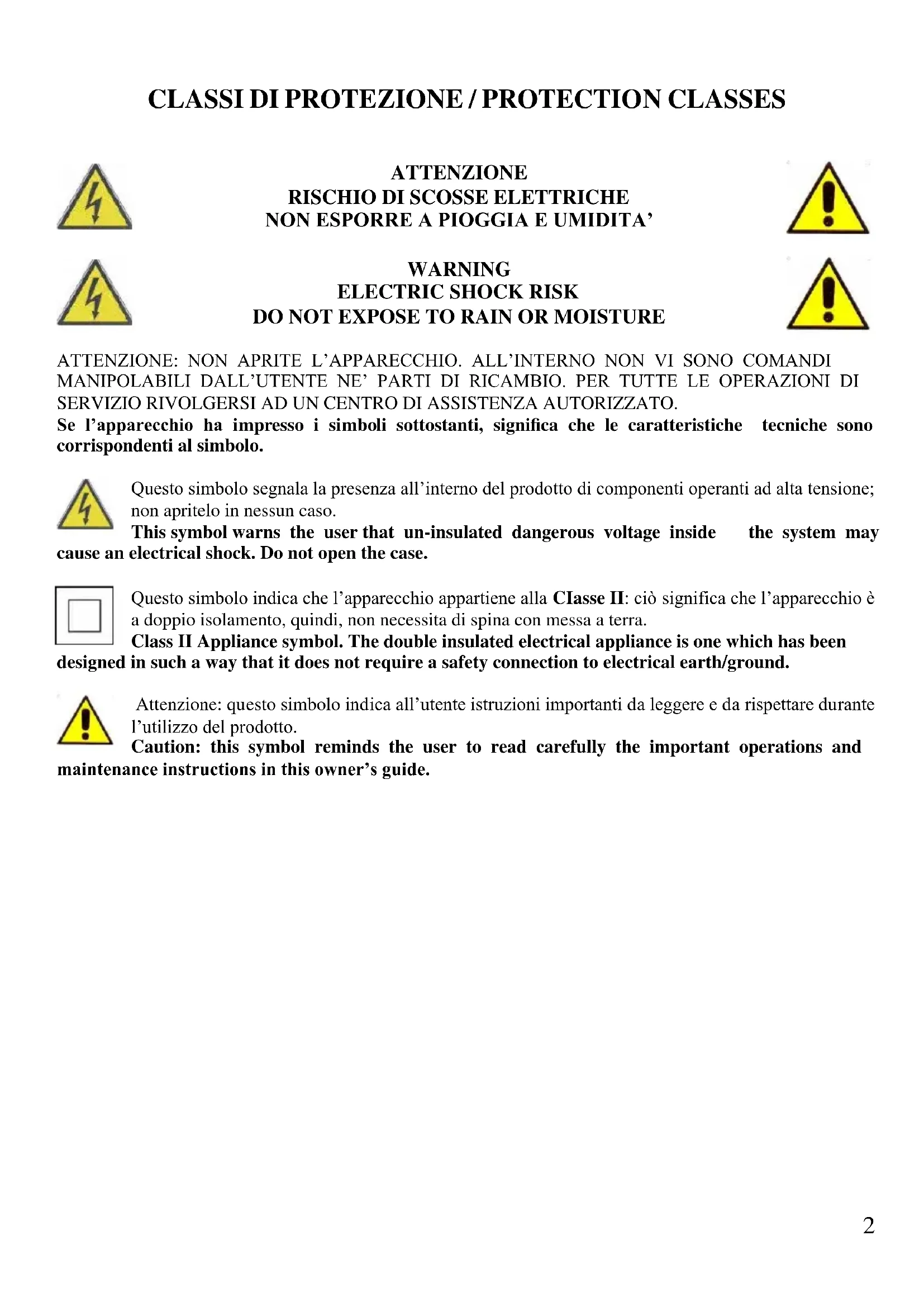 DO NOT EXPOSE TO RAIN OR MOISTURE ATTENZIONE: NON APRITE L’APPARECCHIO. ALL’INTERNO NON VI SONO COMANDI MANIPOLABILI DALL’UTENTE NE’ PARTI DI RICAMBIO. PER TUTTE LE OPERAZIONI DI SERVIZIO RIVOLGERSI AD UN CENTRO DI ASSISTENZA AUTORIZZATO. Se l’apparecchio ha impresso i simboli sottostanti, significa che le caratteristiche tecniche sono corrispondenti al simbolo. Questo simbolo segnala la presenza all’interno del prodotto di componenti operanti ad alta tensione; non apritelo in nessun caso. This symbol warns the user that un-insulated dangerous voltage inside the system may cause an electrical shock. Do not open the case. Questo simbolo indica che l’apparecchio appartiene alla CIasse II: ciò significa che l’apparecchio è a doppio isolamento, quindi, non necessita di spina con messa a terra. Class II Appliance symbol. The double insulated electrical appliance is one which has been designed in such a way that it does not require a safety connection to electrical earth/ground. Attenzione: questo simbolo indica all’utente istruzioni importanti da leggere e da rispettare durante l’utilizzo del prodotto. Caution: this symbol reminds the user to read carefully the important operations and maintenance instructions in this owner’s guide.3