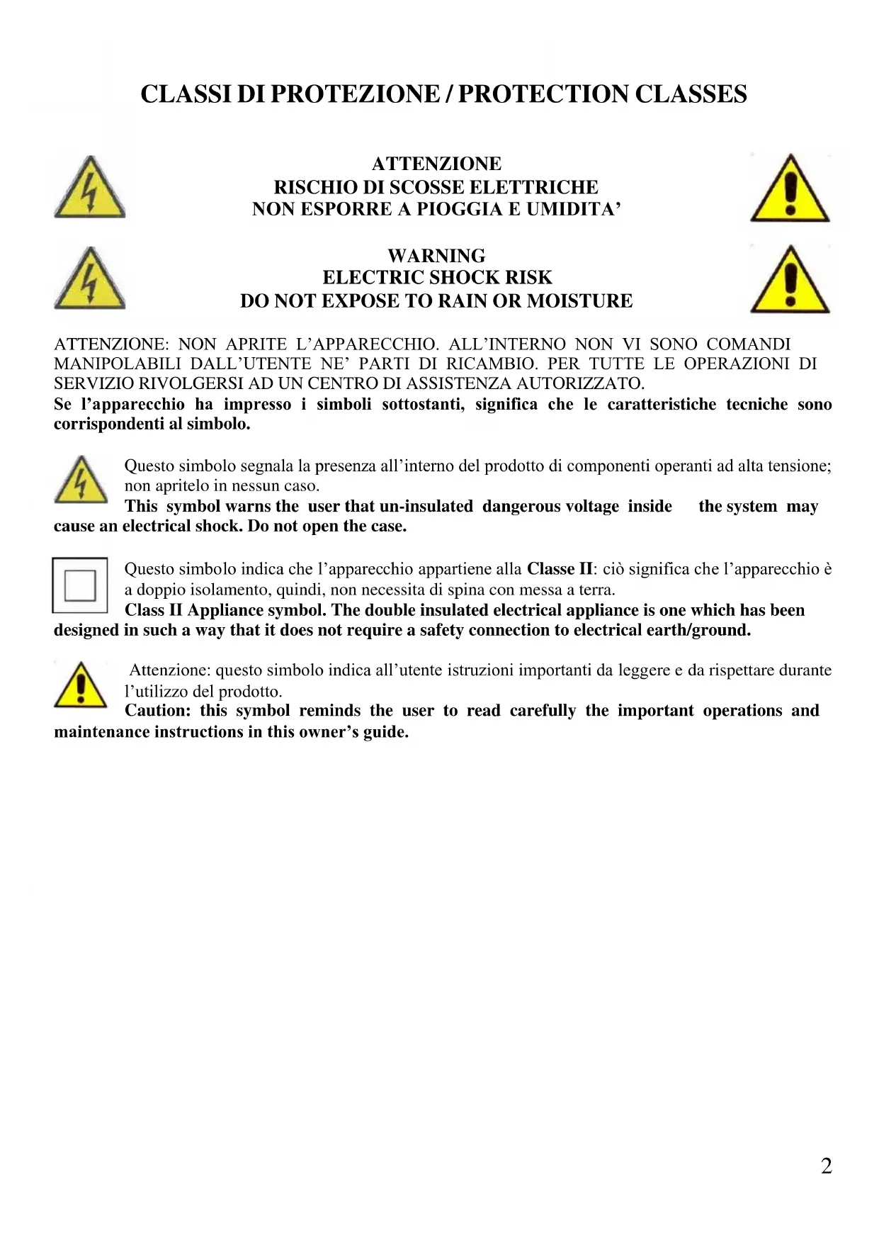 DO NOT EXPOSE TO RAIN OR MOISTURE ATTENZIONE: NON APRITE L’APPARECCHIO. ALL’INTERNO NON VI SONO COMANDI MANIPOLABILI DALL’UTENTE NE’ PARTI DI RICAMBIO. PER TUTTE LE OPERAZIONI DI SERVIZIO RIVOLGERSI AD UN CENTRO DI ASSISTENZA AUTORIZZATO. Se l’apparecchio ha impresso i simboli sottostanti, significa che le caratteristiche tecniche sono corrispondenti al simbolo. Questo simbolo segnala la presenza all’interno del prodotto di componenti operanti ad alta tensione; non apritelo in nessun caso. This symbol warns the user that un-insulated dangerous voltage inside the system may cause an electrical shock. Do not open the case. Questo simbolo indica che l’apparecchio appartiene alla Classe II: ciò significa che l’apparecchio è a doppio isolamento, quindi, non necessita di spina con messa a terra. Class II Appliance symbol. The double insulated electrical appliance is one which has been designed in such a way that it does not require a safety connection to electrical earth/ground. Attenzione: questo simbolo indica all’utente istruzioni importanti da leggere e da rispettare durante l’utilizzo del prodotto. Caution: this symbol reminds the user to read carefully the important operations and maintenance instructions in this owner’s guide.3