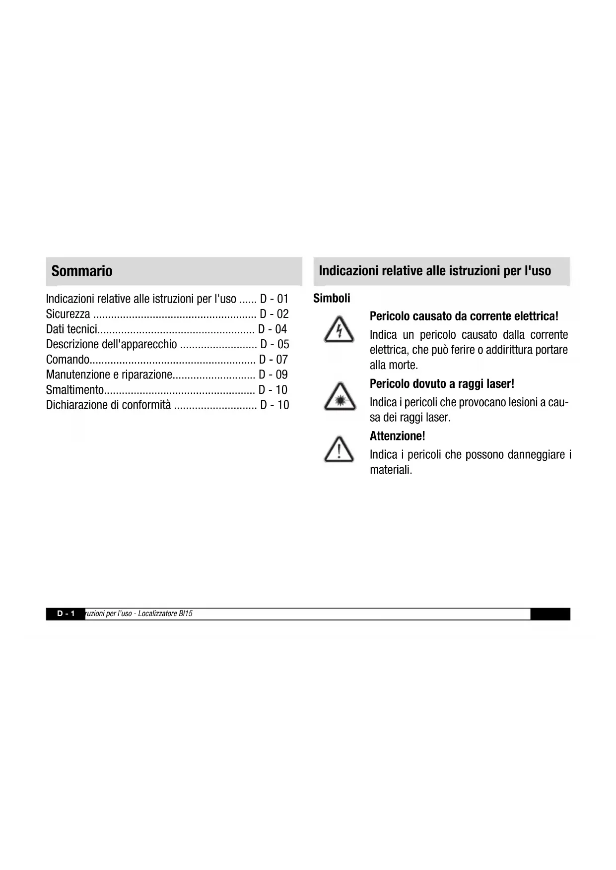- aver letto e capito le istruzioni per l'uso, in particolare il capitolo sulla sicurezza.IT Istruzioni per l’uso - Localizzatore Bl15 D - 4 Dati tecnici Modello BI15 Peso 180 g Misurazioni Alt. x Largh. x Prof. 180 x 67 x 38 mm Potenza laser < 1 mW (630–670 nm) Classe laser ll Precisione laser 12,7 mm con 6,1 m Raggio massimo d'azione del laser fino a 6,1 m Rotazione del laser 180° in scatti da 45° Temperatura di esercizio -7 °C (19,4 °F) fino a +49 °C (120,2 °F) Temperatura di immagazzinaggio -29 °C (20,2 °F) fino a +66 °C (150,8 °F) Umidità relativa dell'aria 33-55 % Profondità massima di individuazione legno fino a 19 mm (3/4") Profondità massima di individuazione metallo + cavi sotto corrente fino a 38 mm (1 1/2") Alimentazione Pila e-block 9 VD - 5 Istruzioni per l’uso - Localizzatore Bl15 IT Descrizione delle funzioni Con il localizzatore Bl15 è possibile localizzare cavi, travi di legno o montanti di metallo fino a una profondità di 19 mm nelle pareti o nei pavimenti. È possibile individu- are la posizione precisa di travi e montanti tramite la visualizzazione dei bordi sul display. Il puntatore laser orientabile a 180° mostra il successivo percorso della trave. Per individuare l'esatto allineamento, l'apparec- chio è dotato di. Grazie alle rotelle di regolazione, l'appa- recchio può essere messo in piano con precisione anche su un pavimento irregolare.