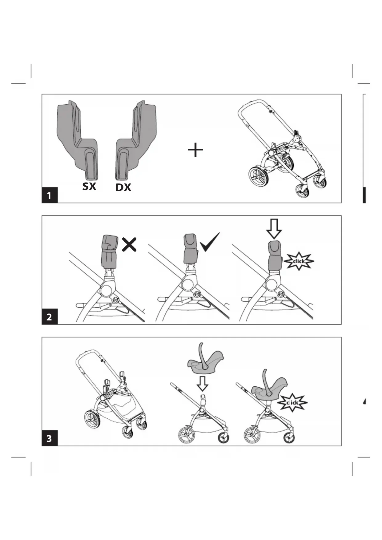 gli adattatori non siano agganciati al seggiolino auto. Rimuovere gli adattatori dal seggiolino auto prima di installarlo in macchina. _ Gli adattatori devono sempre restare agganciati al carrello; non utilizzare mai il seggiolino auto con gli adattatori attaccati quando il seggiolino auto non è utilizzato sul carrello. _ Non lasciare che il bambino giochi con questo prodotto. _ Le operazioni di assemblaggio devono essere eseguite solo da adulti. _ Non utilizzate questo articolo se presenta parti mancanti o rotture. ISTRUZIONI D'USO 1 Ypsi/Z4 Adapter for car seat, posso essere applicati al carrello Ypsi permettendo l'aggancio dei seggiolini auto indicati nel presente manuale. 2 Agganciare gli adattatori al telaio con il pulsante di sgancio rivolto fronte marcia (direzione opposta rispetto al maniglione del telaio), sui relativi supporti sino al click. Ad operazione completata, verificare il corretto aggancio tirando leggermente l’adattatore verso l’alto. 3 E' possibile poi agganciare il seggiolino auto, fino al click, con il bambino rivolto fronte mamma. Per rimuovere il seggiolino auto dal telaio EN_English Thank you for buying a Peg-Pérego product The "Ypsi/Z4 Adapter for car seat" are Peg Perego accessories, compatible with the PegPerego YPSI chassis. They are approved for use with the car seats of other manufacturers and for children from birth up to a maximum weight of 13kg. The “Ypsi/Z4 adapter for car seat” adapters are compatible with most car seats (for use from birth) available on the market. For more information, see the compatibility table on the PegPerego website: www.pegperego.com WARNING IMPORTANT: Read the instructions carefully before use and keep for future reference. Your child's safety could be at risk if you do not follow these instructions. _ Attach the adapters onto the chassis before attaching the infant car seat. _ WARNING: Check the adapters are properly attached onto the chassis and the infant car seat is properly attached to the adapters every time before using. _ Do not fasten the car seat to the chassis if the child weighs more than 13 kg. fare riferimento al manuale istruzione del seggiolino 4 Per sganciare Ypsi/Z4 Adapter for car seat, dal telaio: sganciare il seggiolino auto dagli adattatori , premere il pulsante (1) e sollevare (2) PEG-PÉREGO S.p.A. Peg-Pérego SpA è un azienda con sistema di gestione qualità certificato da TÜV Italia Srl, in accordo alla norma ISO 9001. Peg-Pérego potrà apportare in qualunque momento modifiche ai modelli descritti in questa pubblicazione, per ragioni di natura tecnica o commerciale. SERVIZIO ASSISTENZA PEG-PÉREGO Se fortuitamente parti del modello vengono perse o danneggiate, usare solo pezzi di ricambio originali Peg Pérego. Per eventuali riparazioni, sostituzioni, informazioni sui prodotti, vendita di ricambi originali e accessori, contatta il Servizio Assistenza Peg Pérego indicando il numero seriale del prodotto. tel. 0039/039/60.88.213 numero verde: 800/147.414 (contattabile da rete fissa) e-mail assistenza@pegperego.com sito internet www.pegperego.com Tutti i diritti di proprietà intellettuale relativi ai contenuti di questo manuale d’istruzione appartengono a PEG-PEREGO S.p.A. e sono tutelati dalle leggi vigenti.5 EN_English Thank you for buying a Peg-Pérego product The "Ypsi/Z4 Adapter for car seat" are Peg Perego accessories, compatible with the PegPerego YPSI chassis. They are approved for use with the car seats of other manufacturers and for children from birth up to a maximum weight of 13kg. The “Ypsi/Z4 adapter for car seat” adapters are compatible with most car seats (for use from birth) available on the market. For more information, see the compatibility table on the PegPerego website: www.pegperego.com WARNING IMPORTANT: Read the instructions carefully before use and keep for future reference. Your child's safety could be at risk if you do not follow these instructions. _ Attach the adapters onto the chassis before attaching the infant car seat. _ WARNING: Check the adapters are properly attached onto the chassis and the infant car seat is properly attached to the adapters every time before using. _ Do not fasten the car seat to the chassis if the child weighs more than 13 kg. fare riferimento al manuale istruzione del seggiolino 4 Per sganciare Ypsi/Z4 Adapter for car seat, dal telaio: sganciare il seggiolino auto dagli adattatori , premere il pulsante (1) e sollevare (2) PEG-PÉREGO S.p.A. Peg-Pérego SpA è un azienda con sistema di gestione qualità certificato da TÜV Italia Srl, in accordo alla norma ISO 9001. Peg-Pérego potrà apportare in qualunque momento modifiche ai modelli descritti in questa pubblicazione, per ragioni di natura tecnica o commerciale. SERVIZIO ASSISTENZA PEG-PÉREGO Se fortuitamente parti del modello vengono perse o danneggiate, usare solo pezzi di ricambio originali Peg Pérego. Per eventuali riparazioni, sostituzioni, informazioni sui prodotti, vendita di ricambi originali e accessori, contatta il Servizio Assistenza Peg Pérego indicando il numero seriale del prodotto. tel. 0039/039/60.88.213 numero verde: 800/147.414 (contattabile da rete fissa) e-mail assistenza@pegperego.com sito internet www.pegperego.com Tutti i diritti di proprietà intellettuale relativi ai contenuti di questo manuale d’istruzione appartengono a PEG-PEREGO S.p.A. e sono tutelati dalle leggi vigenti. _ WARNING: Always use the restraint system. _ WARNING: When using the infant car seat in the car, check the adapters are not attached onto the infant car seat. Remove the adapters from the infant car seat before installing it in the car. _ The adapters must always be attached onto the chassis. Never use the infant car seat with the adapters attached unless it is being used on the chassis. _ Do not let the child play with this product. _ The assembly and preparation of the product must be carried out by an adult _ Do not use this item if any parts are missing or broken.