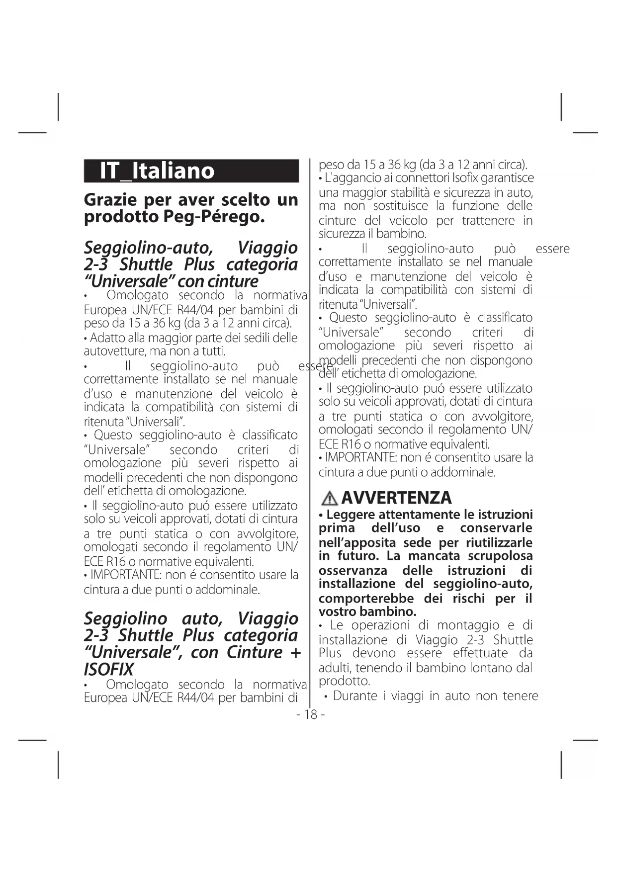 - - 18 - Grazie per aver scelto un prodotto Peg-Pérego. Seggiolino-auto, Viaggio 2-3 Shuttle Plus categoria “Universale” con cinture