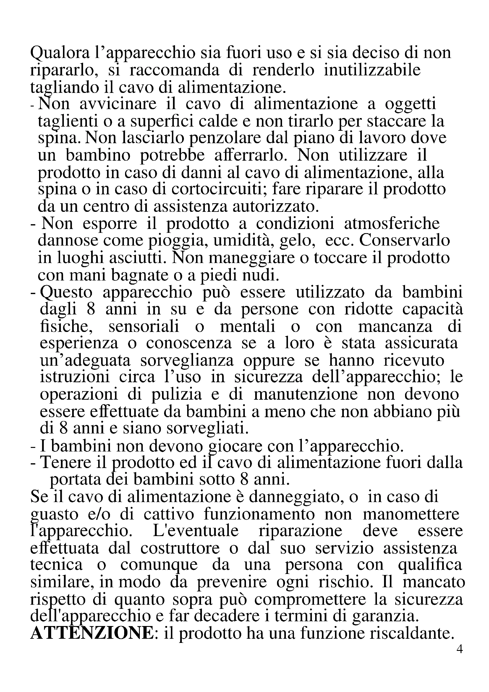 DO NOT EXPOSE TO RAIN OR MOISTURE ATTENZIONE: NON APRITE L’APPARECCHIO. ALL’INTERNO NON VI SONO COMANDI MANIPOLABILI DALL’UTENTE NE’ PARTI DI RICAMBIO. PER TUTTE LE OPERAZIONI DI SERVIZIO RIVOLGERSI AD UN CENTRO DI ASSISTENZA AUTORIZZATO. Se l’apparecchio ha impresso i simboli sottostanti, significa che le caratteristiche tecniche sono corrispondenti al simbolo. Questo simbolo segnala la presenza all’interno del prodotto di componenti operanti ad alta tensione; non apritelo in nessun caso. This symbol warns the user that un-insulated dangerous voltage inside the system may cause an electrical shock. Do not open the case. Questo simbolo indica che l’apparecchio appartiene alla CIasse I: ciò significa che l’apparecchio ha una spina che comprende il polo di messa a terra e va usata esclusivamente su prese provviste di messa a terra. Class I Appliance symbol. This means the appliance must have the chassis connected to electrical earth/ground by an earth conductor. Attenzione: questo simbolo indica all’utente istruzioni importanti da leggere e da rispettare durante l’utilizzo del prodotto. Caution: this symbol reminds the user to read carefully the important operations and maintenance instructions in this owner’s guide.loading-circle-14 Qualora l’apparecchio sia fuori uso e si sia deciso di non ripararlo, si raccomanda di renderlo inutilizzabile tagliando il cavo di alimentazione. - Non avvicinare il cavo di alimentazione a oggetti taglienti o a superfici calde e non tirarlo per staccare la spina. Non lasciarlo penzolare dal piano di lavoro dove un bambino potrebbe afferrarlo. Non utilizzare il prodotto in caso di danni al cavo di alimentazione, alla spina o in caso di cortocircuiti; fare riparare il prodotto da un centro di assistenza autorizzato. - Non esporre il prodotto a condizioni atmosferiche dannose come pioggia, umidità, gelo, ecc. Conservarlo in luoghi asciutti. Non maneggiare o toccare il prodotto con mani bagnate o a piedi nudi. - Questo apparecchio può essere utilizzato da bambini dagli 8 anni in su e da persone con ridotte capacità fisiche, sensoriali o mentali o con mancanza di esperienza o conoscenza se a loro è stata assicurata un’adeguata sorveglianza oppure se hanno ricevuto istruzioni circa l’uso in sicurezza dell’apparecchio; le operazioni di pulizia e di manutenzione non devono essere effettuate da bambini a meno che non abbiano più di 8 anni e siano sorvegliati. - I bambini non devono giocare con l’apparecchio. - Tenere il prodotto ed il cavo di alimentazione fuori dalla portata dei bambini sotto 8 anni. Se il cavo di alimentazione è danneggiato, o in caso di guasto e/o di cattivo funzionamento non manomettere l'apparecchio. L'eventuale riparazione deve essere effettuata dal costruttore o dal suo servizio assistenza tecnica o comunque da una persona con qualifica similare, in modo da prevenire ogni rischio. Il mancato rispetto di quanto sopra può compromettere la sicurezza dell'apparecchio e far decadere i termini di garanzia. ATTENZIONE: il prodotto ha una funzione riscaldante.5 Le superfici possono sviluppare alte temperature. Dato che la percezione della temperatura è diversa per ogni persona, utilizzare l’apparecchio con cautela. Toccare solo le superfici progettate per essere toccate. - Questo apparecchio è progettato per uso domestico o applicazioni simili come: cucine per il personale in negozi, uffici o altri luoghi di lavoro, per i clienti in hotel, motel, bed & breakfast o residence. - L’apparecchio non è progettato per essere usato attraverso timer esterni o telecomandi. Prima di ogni utilizzo svolgere il cavo di alimentazione. - Non sottoporre il prodotto ad urti, potrebbero danneggiarlo. Utilizzare solo ricambi ed accessori originali e compatibili. - Non utilizzare sotto o accanto a materiali infiammabili come le tende, fonti di calore, zone fredde e vapore.