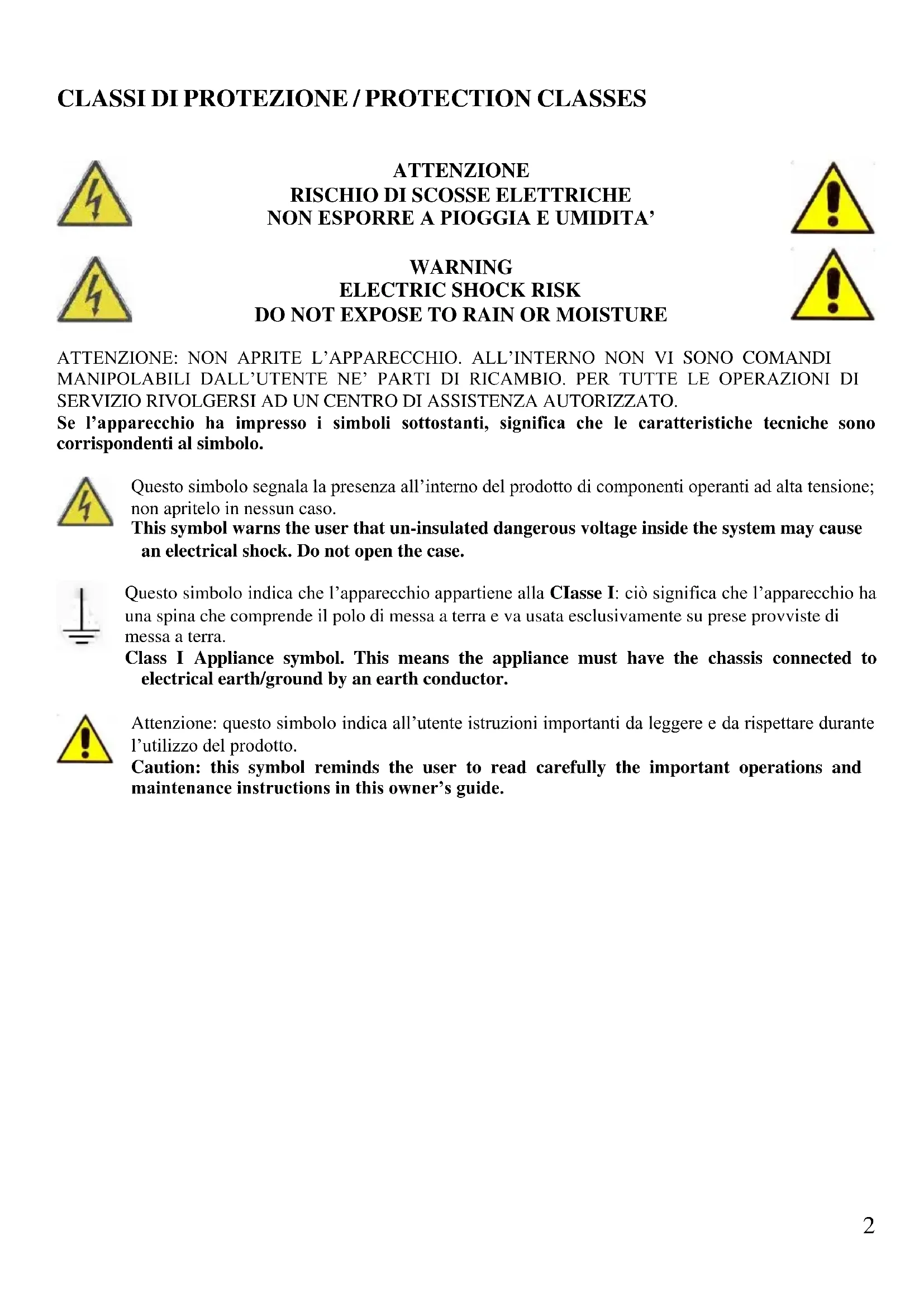 DO NOT EXPOSE TO RAIN OR MOISTURE ATTENZIONE: NON APRITE L’APPARECCHIO. ALL’INTERNO NON VI SONO COMANDI MANIPOLABILI DALL’UTENTE NE’ PARTI DI RICAMBIO. PER TUTTE LE OPERAZIONI DI SERVIZIO RIVOLGERSI AD UN CENTRO DI ASSISTENZA AUTORIZZATO. Se l’apparecchio ha impresso i simboli sottostanti, significa che le caratteristiche tecniche sono corrispondenti al simbolo. Questo simbolo segnala la presenza all’interno del prodotto di componenti operanti ad alta tensione; non apritelo in nessun caso. This symbol warns the user that un-insulated dangerous voltage inside the system may cause an electrical shock. Do not open the case. Questo simbolo indica che l’apparecchio appartiene alla CIasse I: ciò significa che l’apparecchio ha una spina che comprende il polo di messa a terra e va usata esclusivamente su prese provviste di messa a terra. Class I Appliance symbol. This means the appliance must have the chassis connected to electrical earth/ground by an earth conductor. Attenzione: questo simbolo indica all’utente istruzioni importanti da leggere e da rispettare durante l’utilizzo del prodotto. Caution: this symbol reminds the user to read carefully the important operations and maintenance instructions in this owner’s guide.3