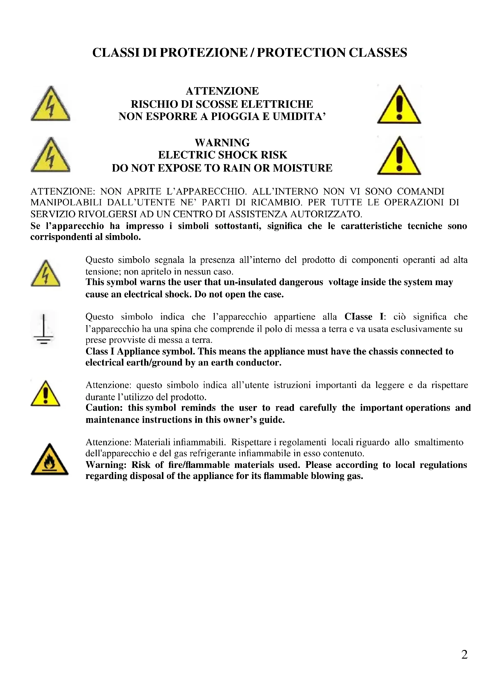 DO NOT EXPOSE TO RAIN OR MOISTURE ATTENZIONE: NON APRITE L’APPARECCHIO. ALL’INTERNO NON VI SONO COMANDI MANIPOLABILI DALL’UTENTE NE’ PARTI DI RICAMBIO. PER TUTTE LE OPERAZIONI DI SERVIZIO RIVOLGERSI AD UN CENTRO DI ASSISTENZA AUTORIZZATO. Se l’apparecchio ha impresso i simboli sottostanti, significa che le caratteristiche tecniche sono corrispondenti al simbolo. Questo simbolo segnala la presenza all’interno del prodotto di componenti operanti ad alta tensione; non apritelo in nessun caso. This symbol warns the user that un-insulated dangerous voltage inside the system may cause an electrical shock. Do not open the case. Questo simbolo indica che l’apparecchio appartiene alla CIasse I: ciò significa che l’apparecchio ha una spina che comprende il polo di messa a terra e va usata esclusivamente su prese provviste di messa a terra. Class I Appliance symbol. This means the appliance must have the chassis connected to electrical earth/ground by an earth conductor. Attenzione: questo simbolo indica all’utente istruzioni importanti da leggere e da rispettare durante l’utilizzo del prodotto. Caution: this symbol reminds the user to read carefully the important operations and maintenance instructions in this owner’s guide. Attenzione: Materiali infiammabili. Rispettare i regolamenti locali riguardo allo smaltimento dell'apparecchio e del gas refrigerante infiammabile in esso contenuto.