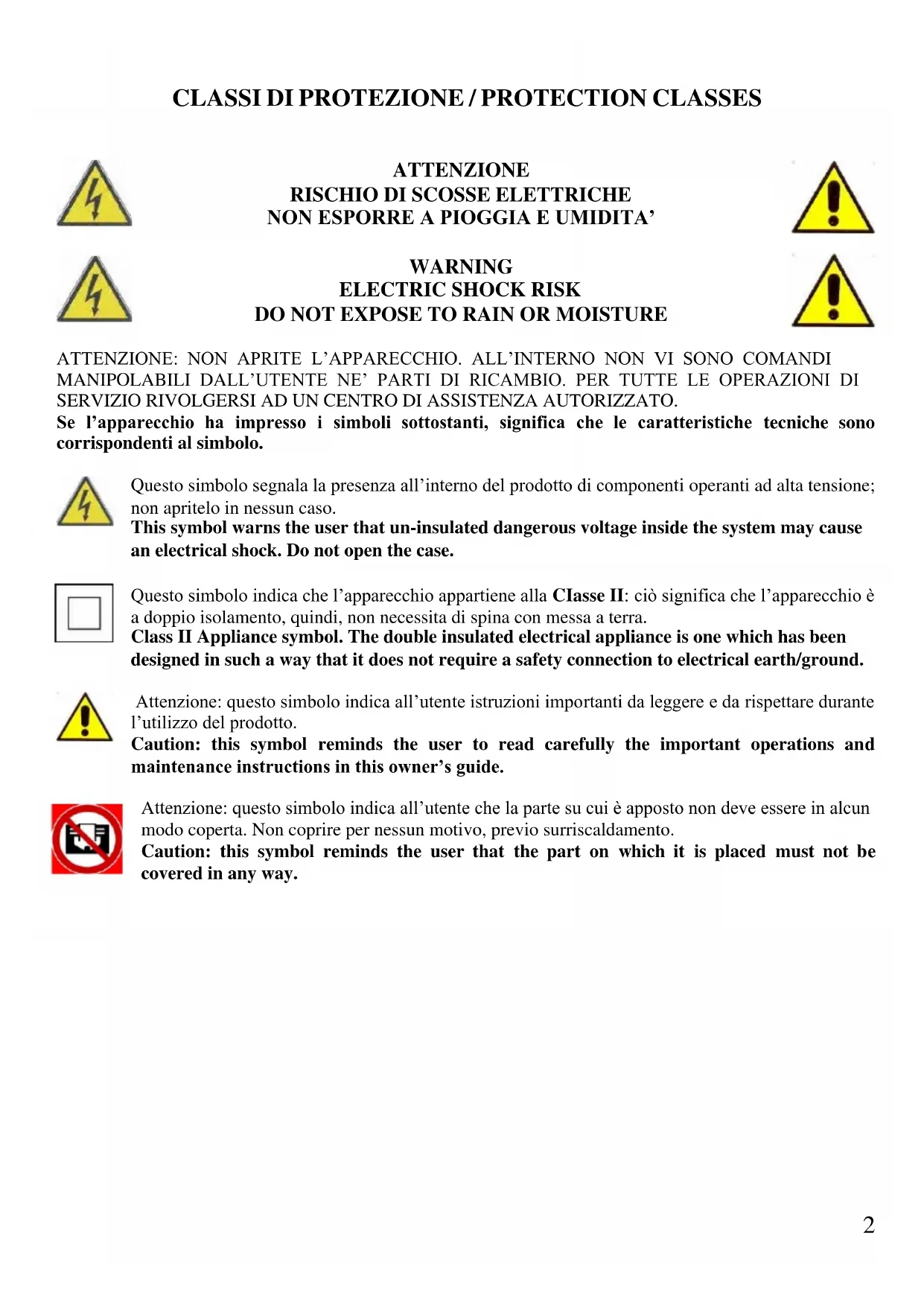 DO NOT EXPOSE TO RAIN OR MOISTURE ATTENZIONE: NON APRITE L’APPARECCHIO. ALL’INTERNO NON VI SONO COMANDI MANIPOLABILI DALL’UTENTE NE’ PARTI DI RICAMBIO. PER TUTTE LE OPERAZIONI DI SERVIZIO RIVOLGERSI AD UN CENTRO DI ASSISTENZA AUTORIZZATO. Se l’apparecchio ha impresso i simboli sottostanti, significa che le caratteristiche tecniche sono corrispondenti al simbolo. Questo simbolo segnala la presenza all’interno del prodotto di componenti operanti ad alta tensione; non apritelo in nessun caso. This symbol warns the user that un-insulated dangerous voltage inside the system may cause an electrical shock. Do not open the case. Questo simbolo indica che l’apparecchio appartiene alla CIasse II: ciò significa che l’apparecchio è a doppio isolamento, quindi, non necessita di spina con messa a terra. Class II Appliance symbol. The double insulated electrical appliance is one which has been designed in such a way that it does not require a safety connection to electrical earth/ground. Attenzione: questo simbolo indica all’utente istruzioni importanti da leggere e da rispettare durante l’utilizzo del prodotto. Caution: this symbol reminds the user to read carefully the important operations and maintenance instructions in this owner’s guide. Attenzione: questo simbolo indica all’utente che la parte su cui è apposto non deve essere in alcun modo coperta. Non coprire per nessun motivo, previo surriscaldamento. Caution: this symbol reminds the user that the part on which it is placed must not be covered in any way.3