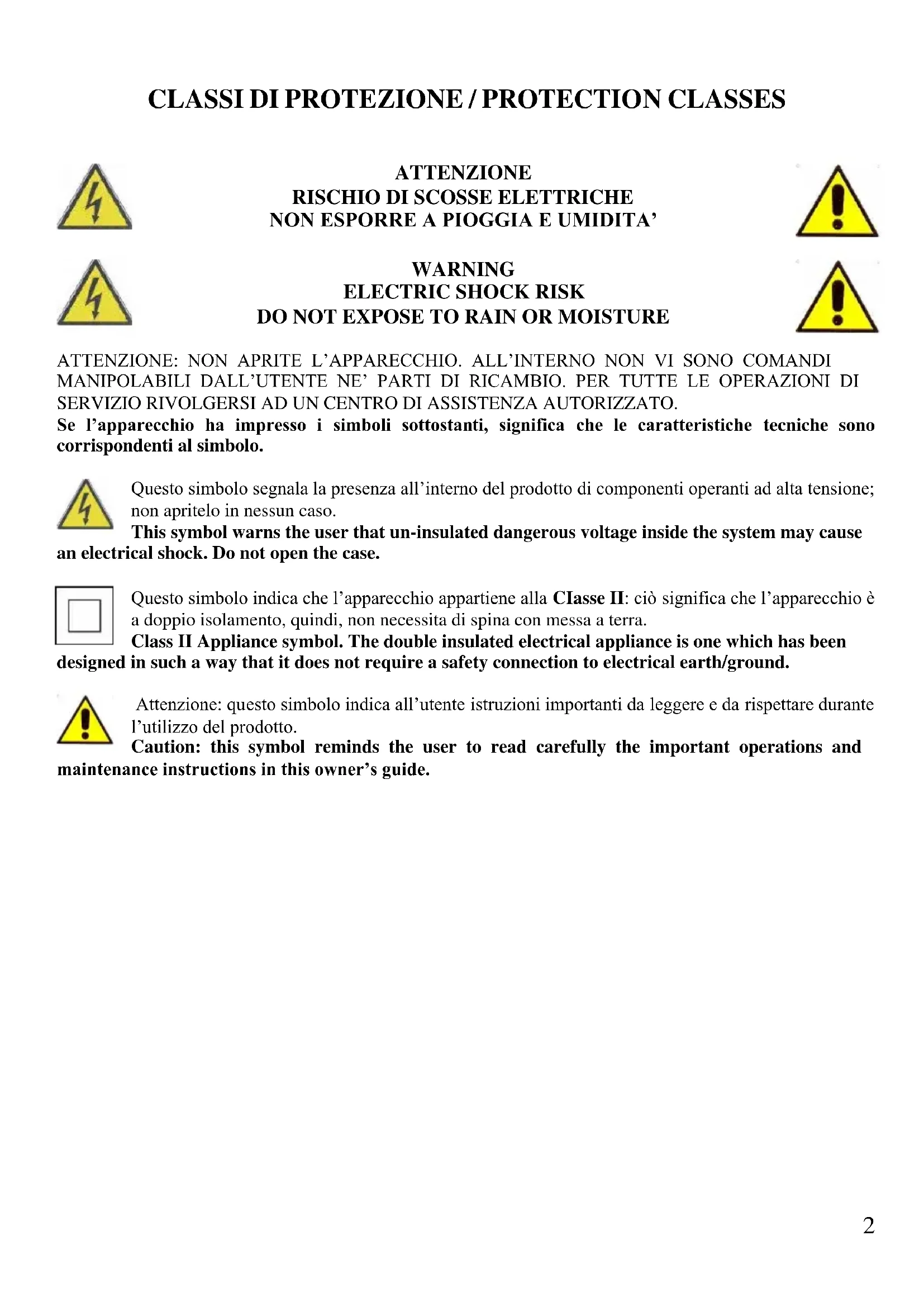 DO NOT EXPOSE TO RAIN OR MOISTURE ATTENZIONE: NON APRITE L’APPARECCHIO. ALL’INTERNO NON VI SONO COMANDI MANIPOLABILI DALL’UTENTE NE’ PARTI DI RICAMBIO. PER TUTTE LE OPERAZIONI DI SERVIZIO RIVOLGERSI AD UN CENTRO DI ASSISTENZA AUTORIZZATO. Se l’apparecchio ha impresso i simboli sottostanti, significa che le caratteristiche tecniche sono corrispondenti al simbolo. Questo simbolo segnala la presenza all’interno del prodotto di componenti operanti ad alta tensione; non apritelo in nessun caso. This symbol warns the user that un-insulated dangerous voltage inside the system may cause an electrical shock. Do not open the case. Questo simbolo indica che l’apparecchio appartiene alla CIasse II: ciò significa che l’apparecchio è a doppio isolamento, quindi, non necessita di spina con messa a terra. Class II Appliance symbol. The double insulated electrical appliance is one which has been designed in such a way that it does not require a safety connection to electrical earth/ground. Attenzione: questo simbolo indica all’utente istruzioni importanti da leggere e da rispettare durante l’utilizzo del prodotto. Caution: this symbol reminds the user to read carefully the important operations and maintenance instructions in this owner’s guide.3