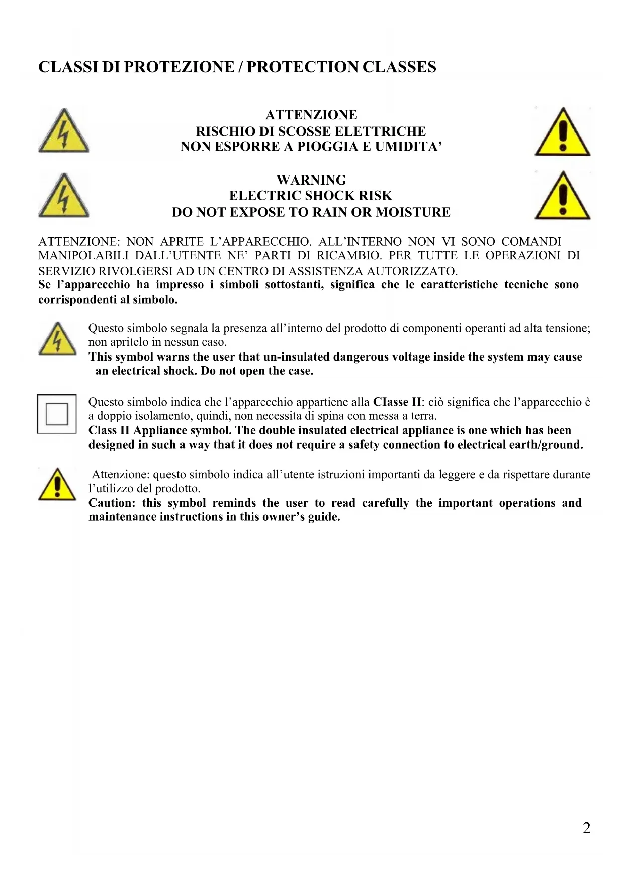 DO NOT EXPOSE TO RAIN OR MOISTURE ATTENZIONE: NON APRITE L’APPARECCHIO. ALL’INTERNO NON VI SONO COMANDI MANIPOLABILI DALL’UTENTE NE’ PARTI DI RICAMBIO. PER TUTTE LE OPERAZIONI DI SERVIZIO RIVOLGERSI AD UN CENTRO DI ASSISTENZA AUTORIZZATO. Se l’apparecchio ha impresso i simboli sottostanti, significa che le caratteristiche tecniche sono corrispondenti al simbolo. Questo simbolo segnala la presenza all’interno del prodotto di componenti operanti ad alta tensione; non apritelo in nessun caso. This symbol warns the user that un-insulated dangerous voltage inside the system may cause an electrical shock. Do not open the case. Questo simbolo indica che l’apparecchio appartiene alla CIasse II: ciò significa che l’apparecchio è a doppio isolamento, quindi, non necessita di spina con messa a terra. Class II Appliance symbol. The double insulated electrical appliance is one which has been designed in such a way that it does not require a safety connection to electrical earth/ground. Attenzione: questo simbolo indica all’utente istruzioni importanti da leggere e da rispettare durante l’utilizzo del prodotto. Caution: this symbol reminds the user to read carefully the important operations and maintenance instructions in this owner’s guide.3