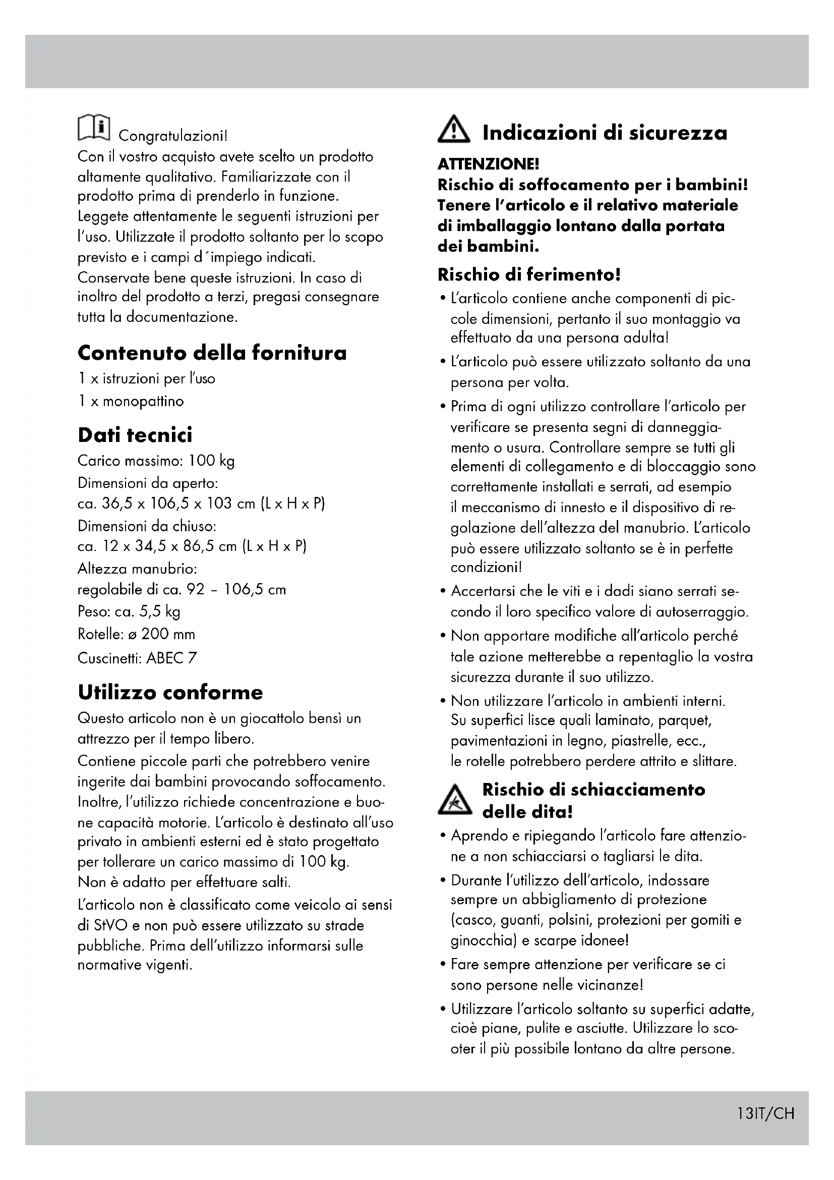 - Utilizzarel’articolosoltantosusuperficiadatte, cioè piane, pulite e asciutte. Utilizzare lo sco- oter il più possibile lontano da altre persone.14 IT/CH Evitare terreni accidentati, scale e acque aperte.