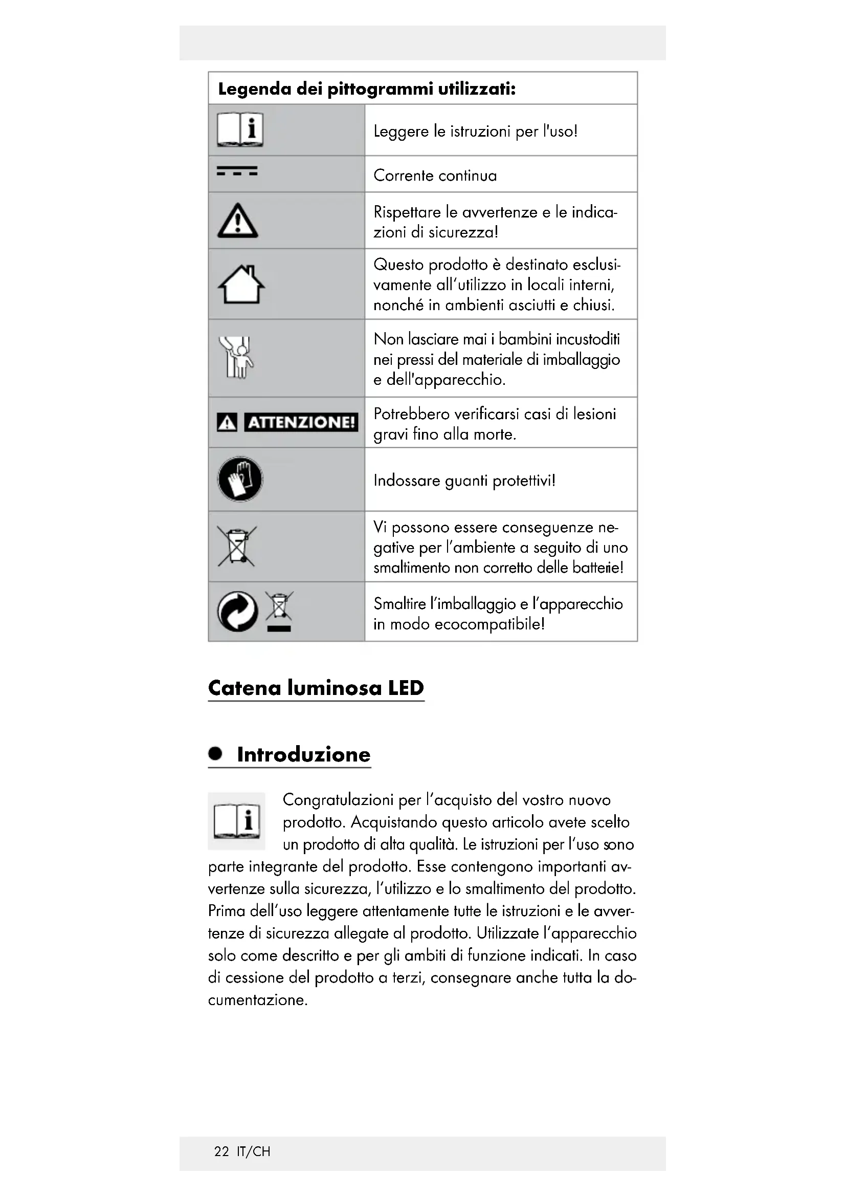 e dell'apparecchio. Potrebbero verificarsi casi di lesioni gravi fino alla morte. Indossare guanti protettivi! Vi possono essere conseguenze ne- gative per l’ambiente a seguito di uno smaltimento non corretto delle batter ie! Smaltire l’imballaggio e l’apparecchio in modo ecocompatibile! Catena luminosa LED Introduzione Congratulazioni per l‘acquisto del vostro nuovo prodotto. Acquistando questo articolo avete scelto un prodotto di alta qualità. Le istruzioni per l‘uso s ono parte integrante del prodotto. Esse contengono importanti av- vertenze sulla sicurezza, l‘utilizzo e lo smaltimento del prodotto. Prima dell‘uso leggere attentamente tutte le istruzioni e le avver- tenze di sicurezza allegate al prodotto. Utilizzate l‘apparecchio solo come descritto e per gli ambiti di funzione indicati. In caso di cessione del prodotto a terzi, consegnare anche tutta la do- cumentazione.23 IT/CH Utilizzo secondo la destinazione d’uso La catena luminosa a LED è utilizzata solamente come luce decorativa in ambienti interni asciutti. Il prodotto è destinato all‘utilizzo in ambito privato e non per scopi commerciali. Questo prodotto è destinato esclusivamente all‘utilizzo in locali interni, nonché in ambienti asciutti e chiusi. Descrizione dei componenti