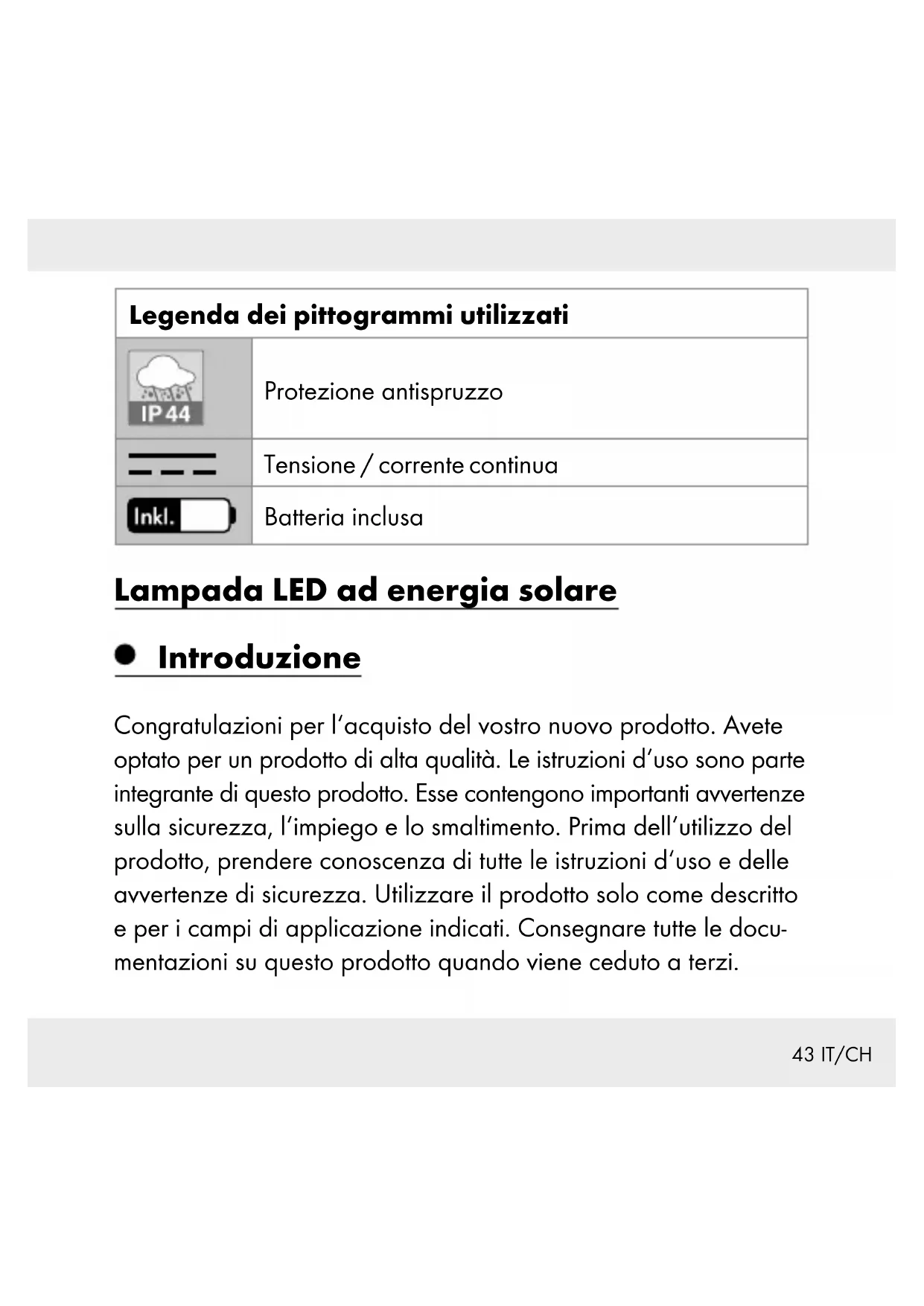 300 mAh LED: 2 x LED Potenza LED: ca. 3 mW per LED Grado di protezione: IP44 (protetto contro gli spruzzi d’acqua) Cella fotovoltaica: ca. 40 x 40 mm Durata d‘illuminazione (a batteria completamente carica): ca. 8 ore Avvertenze per la sicurezza LEGGERE LE ISTRUZIONI PRIMA DELL‘USO! CONSERVARE CON CURA LE ISTRUZIONI PER L‘USO! CONSEGNARE TUTTA LA DOCUMENTAZIONE RELATIVA AL PRODOTTO IN CASO DI CESSIONE A TERZI.46 IT/CH Questo prodotto non è adatto a bambini di età in- feriore a 14 anni. Tenere lontano dalla portata dei bambini. Non utilizzare il prodotto qualora si rilevassero danneggiamenti. Se viene conservato in un ambiente buio, spegnere il prodotto per evitare che la batteria si scarichi. La lampadina non è sostituibile. Sostituire l‘intero prodotto, qualora la lampadina giungesse al termine della propria vita media. Il prodotto non è un giocattolo. Avvertenze di sicurezza specifiche del prodotto Assicurarsi che la cella fotovoltaica non si sporchi o che non venga coperta da neve e ghiaccio in inverno. Ciò comporte- rebbe una riduzione in termini di efficienza della cella fotovol- taica. Le basse temperature incidono negativamente sulla durata della batteria ricaricabile. Qualora il prodotto non venisse47 IT/CH utilizzato per lungo tempo, ad esempio in inverno, questo deve essere pulito e conservato in un luogo asciutto e caldo. Avvertenze di sicurezza per batterie / accumulatori PERICOLO DI MORTE! Tenere le batterie / gli accumulatori fuori dalla portata dei bambini. In caso di ingerimento consul- tare subito un medico! L’ingerimento può provocare ustioni, perforazione di tessuti molli e la morte. Eventuali ustioni gravi possono comparire anche nel corso delle 2 ore successive all’ingerimento. PERICOLO DI ESPLOSIONE! Non ricaricare mai batterie non ricaricabili. Non cortocircuitare e / o aprire le batterie o gli accumulatori. Ne con- seguirebbe un rischio di incendio, surriscaldamento o scoppio. Non gettare mai le batterie / gli accumulatori nel fuoco o in acqua. Non esercitare alcuna pressione meccanica sulle batterie / su- gli accumulatori.48 IT/CH Rischio di perdita di liquido dalle batterie / dagli accu- mulatori Evitare condizioni e temperature estreme che possano riper- cuotersi sulle batterie / sugli accumulatori, quali ad esempio la vicinanza a termosifoni o l‘irraggiamento solare diretto. Evitare il contatto delle sostanze chimiche con la pelle, gli oc- chi e le mucose in caso di fuoriuscita del liquido dalle batte- rie / dagli accumulatori! Sciacquare subito le aree colpite con acqua pulita e consultare immediatamente un medico! INDOSSARE GUANTI PROTETTIVI! Batterie e accumulatori danneggiati o che presentano perdite possono corrodere la pelle in caso di contatto. Pertanto, in questo caso indossare sempre guanti di protezione adatti. Nel caso di perdita di liquido delle batterie / degli accumulatori, rimuoverli subito dal prodotto per evitare danneggiamenti. Utilizzare solamente batterie / gli accumulatori dello stesso tipo. Non mischiare le batterie / gli accumulatori vecchi con quelli nuovi! Rimuovere le batterie / gli accumulatori, quando il prodotto non viene utilizzato a lungo.49 IT/CH Rischio di danneggiamento del prodotto Utilizzare esclusivamente il tipo di batterie / di accumulatori in- dicato! Inserire le batterie / gli accumulatori secondo il contrassegno della polarità (+) e (-) sulla batteria / sull‘accumulatore del prodotto. Pulire i contatti della batteria / dell‘accumulatore e del vano portabatterie prima dell‘inserimento! Rimuovere immediatamente le batterie / gli accumulatori esau- sti dal prodotto. Principio di funzionamento In presenza di irradiazione solare, la cella fotovoltaica installata nel prodotto trasforma la luce in energia elettrica e la incamera in una batteria ricaricabile Ni-MH. Accendere il prodotto tramite l‘interruttore ACCENSIONE / SPEGNIMENTO