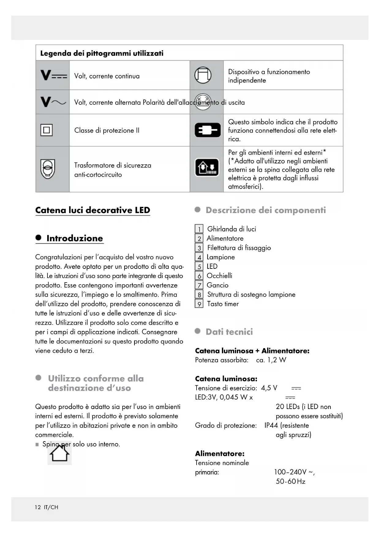 Tasto timer Dati tecnici Catena luminosa + Alimentatore: Potenza assorbita: ca. 1,2 W Catena luminosa: Tensione di esercizio: 4,5 V LED: 3 V , 0,045 W x 20 LEDs (i LED non possono essere sostituiti) Grado di protezione: IP44 (resistente agli spruzzi) Alimentatore: Tensione nominale primaria: 100–240 V