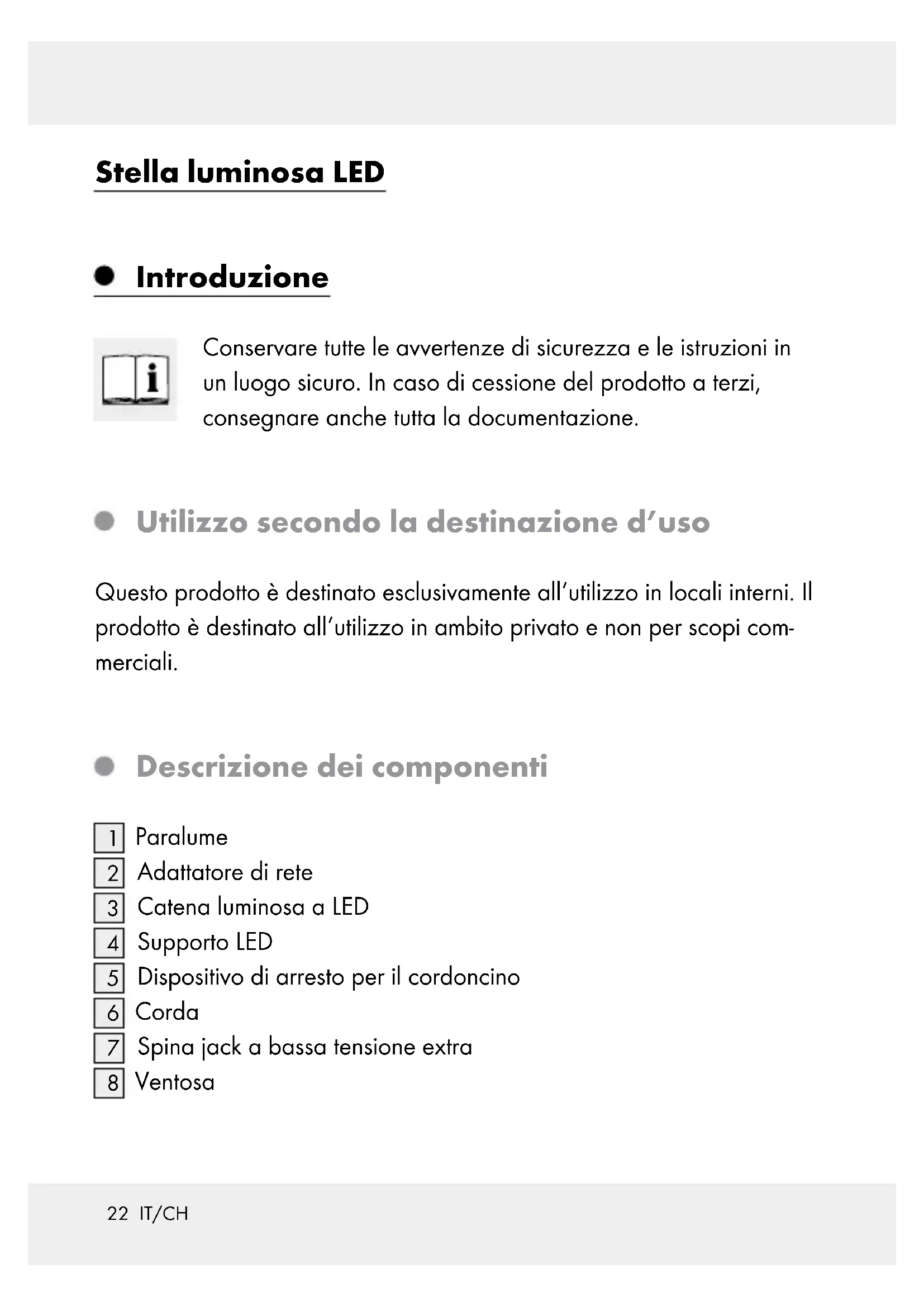 Ventosa23 IT/CH Dati tecnici Catena luminosa a LED: Tensione nominale: 30 V , 0,2 W Lampadina: 10 x LED, 3 V , 0,06 W (LED non sostituibili) Classe di protezione: Catena luminosa a LED (modello nr. 114234-15-01/114234-15-02/ 114234-15-03) testata TÜV / GS. Adattatore di corrente: Tensione nominale, primaria: 230–240 V∼, 50 Hz Tensione nominale, secondaria: 30 V 0,6 W Classe di protezione: Adattatore di rete (modello nr. THDQ-D-300006) testato ITS/GS. Potenza assorbita (adattatore incluso): ca. 0,5 W Modello n°: 114234-15-01: rosso 114234-15-02: argento 114234-15-03: oro Contenuto della confezione 1 Catena luminosa a LED 1 Supporto LED 1 Paralume 1 Ventosa24 IT/CH 1 Adattatore di corrente 1 Manuale di istruzioni Indicazioni per la sicurezza