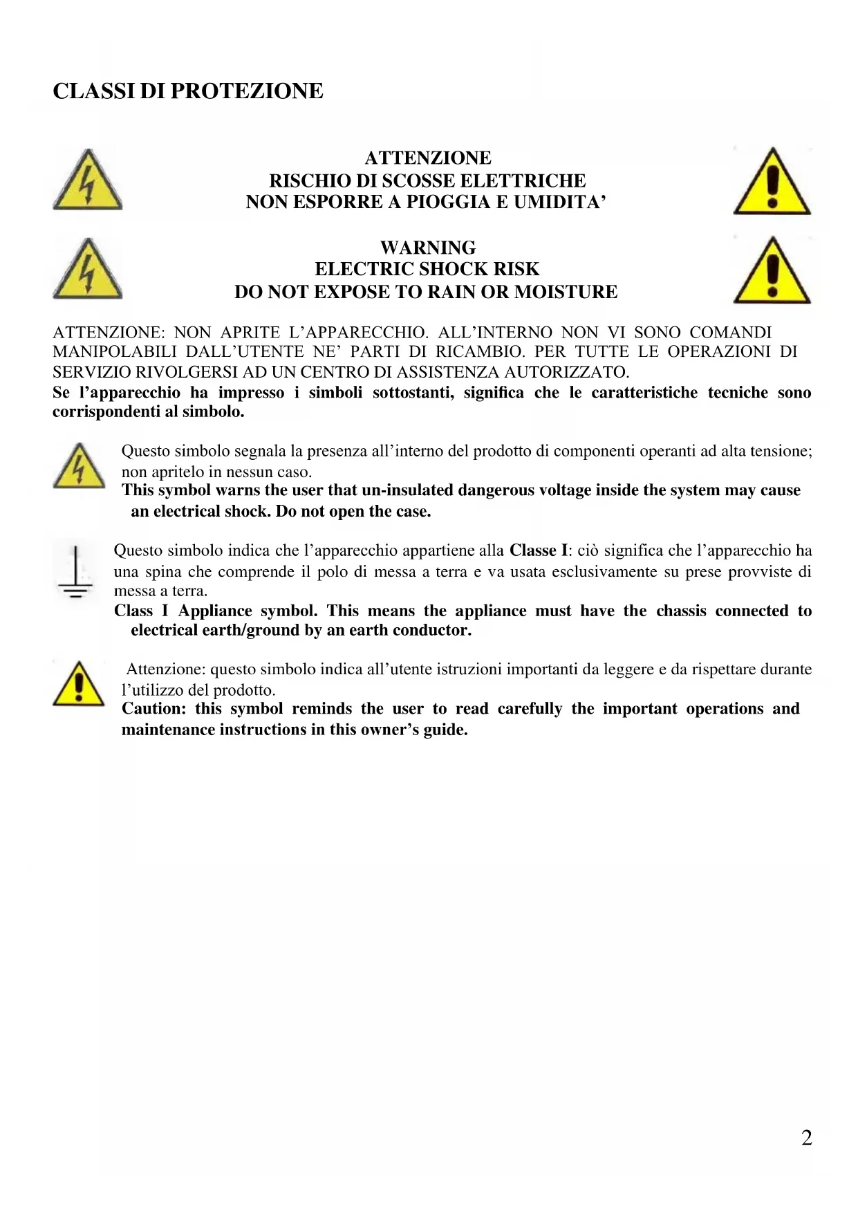 DO NOT EXPOSE TO RAIN OR MOISTURE ATTENZIONE: NON APRITE L’APPARECCHIO. ALL’INTERNO NON VI SONO COMANDI MANIPOLABILI DALL’UTENTE NE’ PARTI DI RICAMBIO. PER TUTTE LE OPERAZIONI DI SERVIZIO RIVOLGERSI AD UN CENTRO DI ASSISTENZA AUTORIZZATO. Se l’apparecchio ha impresso i simboli sottostanti, significa che le caratteristiche tecniche sono corrispondenti al simbolo. Questo simbolo segnala la presenza all’interno del prodotto di componenti operanti ad alta tensione; non apritelo in nessun caso. This symbol warns the user that un-insulated dangerous voltage inside the system may cause an electrical shock. Do not open the case. Questo simbolo indica che l’apparecchio appartiene alla Classe I: ciò significa che l’apparecchio ha una spina che comprende il polo di messa a terra e va usata esclusivamente su prese provviste di messa a terra. Class I Appliance symbol. This means the appliance must have the chassis connected to electrical earth/ground by an earth conductor. Attenzione: questo simbolo indica all’utente istruzioni importanti da leggere e da rispettare durante l’utilizzo del prodotto. Caution: this symbol reminds the user to read carefully the important operations and maintenance instructions in this owner’s guide.3