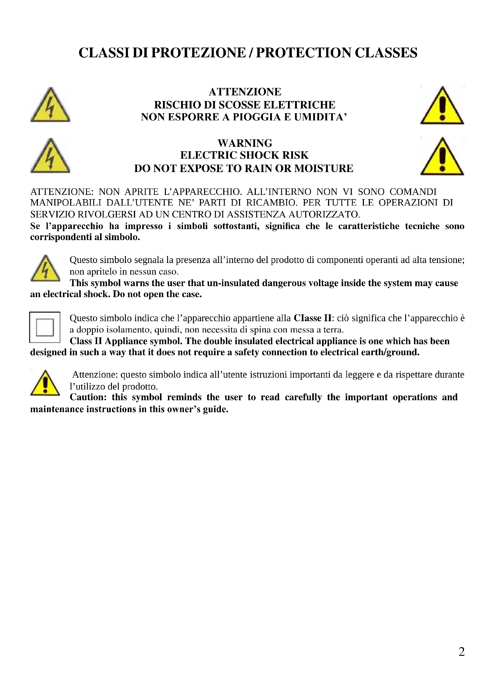 DO NOT EXPOSE TO RAIN OR MOISTURE ATTENZIONE: NON APRITE L’APPARECCHIO. ALL’INTERNO NON VI SONO COMANDI MANIPOLABILI DALL’UTENTE NE’ PARTI DI RICAMBIO. PER TUTTE LE OPERAZIONI DI SERVIZIO RIVOLGERSI AD UN CENTRO DI ASSISTENZA AUTORIZZATO. Se l’apparecchio ha impresso i simboli sottostanti, significa che le caratteristiche tecniche sono corrispondenti al simbolo. Questo simbolo segnala la presenza all’interno del prodotto di componenti operanti ad alta tensione; non apritelo in nessun caso. This symbol warns the user that un-insulated dangerous voltage inside the system may cause an electrical shock. Do not open the case. Questo simbolo indica che l’apparecchio appartiene alla CIasse II: ciò significa che l’apparecchio è a doppio isolamento, quindi, non necessita di spina con messa a terra. Class II Appliance symbol. The double insulated electrical appliance is one which has been designed in such a way that it does not require a safety connection to electrical earth/ground. Attenzione: questo simbolo indica all’utente istruzioni importanti da leggere e da rispettare durante l’utilizzo del prodotto. Caution: this symbol reminds the user to read carefully the important operations and maintenance instructions in this owner’s guide.3