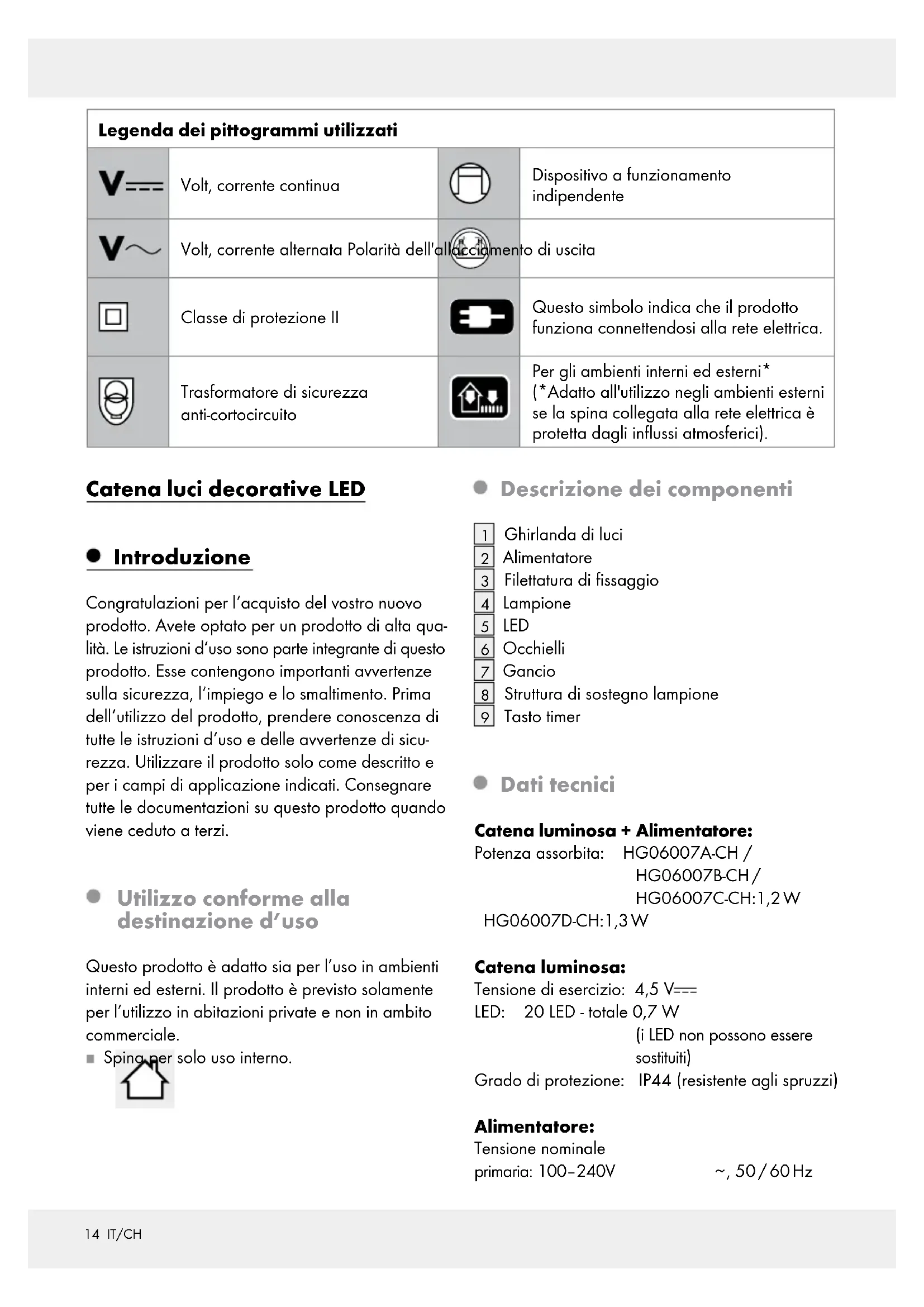 Tasto timer Dati tecnici Catena luminosa + Alimentatore: Potenza assorbita: HG06007A-CH / HG06007B-CH / HG06007C-CH:1,2 W HG06007D-CH:1,3 W Catena luminosa: Tensione di esercizio: 4,5 V LED: 20 LED - totale 0,7 W (i LED non possono essere sostituiti) Grado di protezione: IP44 (resistente agli spruzzi) Alimentatore: Tensione nominale primaria: 100–240 V