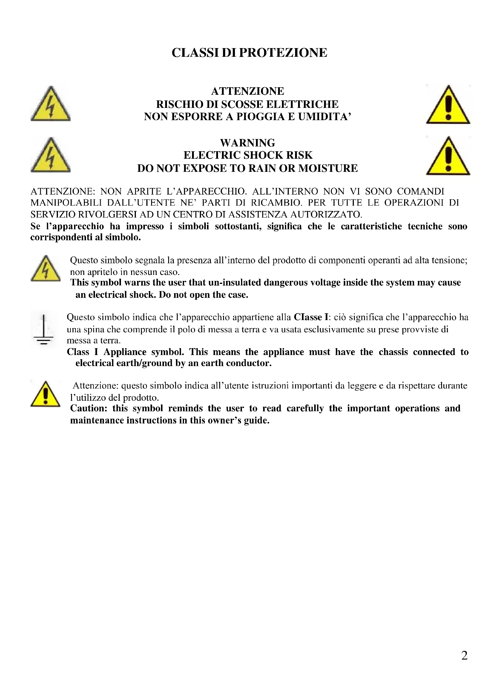 DO NOT EXPOSE TO RAIN OR MOISTURE ATTENZIONE: NON APRITE L’APPARECCHIO. ALL’INTERNO NON VI SONO COMANDI MANIPOLABILI DALL’UTENTE NE’ PARTI DI RICAMBIO. PER TUTTE LE OPERAZIONI DI SERVIZIO RIVOLGERSI AD UN CENTRO DI ASSISTENZA AUTORIZZATO. Se l’apparecchio ha impresso i simboli sottostanti, significa che le caratteristiche tecniche sono corrispondenti al simbolo. Questo simbolo segnala la presenza all’interno del prodotto di componenti operanti ad alta tensione; non apritelo in nessun caso. This symbol warns the user that un-insulated dangerous voltage inside the system may cause an electrical shock. Do not open the case. Questo simbolo indica che l’apparecchio appartiene alla CIasse I: ciò significa che l’apparecchio ha una spina che comprende il polo di messa a terra e va usata esclusivamente su prese provviste di messa a terra. Class I Appliance symbol. This means the appliance must have the chassis connected to electrical earth/ground by an earth conductor. Attenzione: questo simbolo indica all’utente istruzioni importanti da leggere e da rispettare durante l’utilizzo del prodotto. Caution: this symbol reminds the user to read carefully the important operations and maintenance instructions in this owner’s guide.3