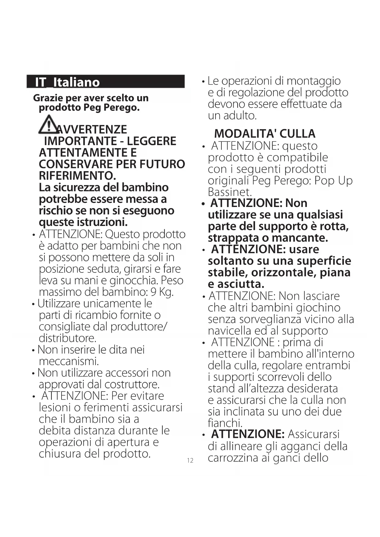 - Le operazioni di montaggio e di regolazione del prodotto devono essere effettuate da un adulto. MODALITA' CULLA