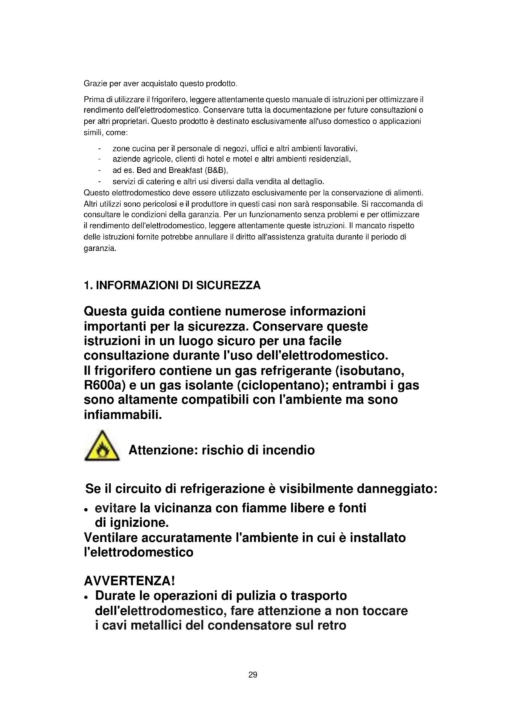 Questa guida contiene numerose informazioni importanti per la sicurezza. Conservare queste istruzioni in un luogo sicuro per una facile consultazione durante l'uso dell'elettrodomestico. Il frigorifero contiene un gas refrigerante (isobutano, R600a) e un gas isolante (ciclopentano); entrambi i gas sono altamente compatibili con l'ambiente ma sono infiammabili. Attenzione: rischio di incendio Se il circuito di refrigerazione è visibilmente danneggiato: