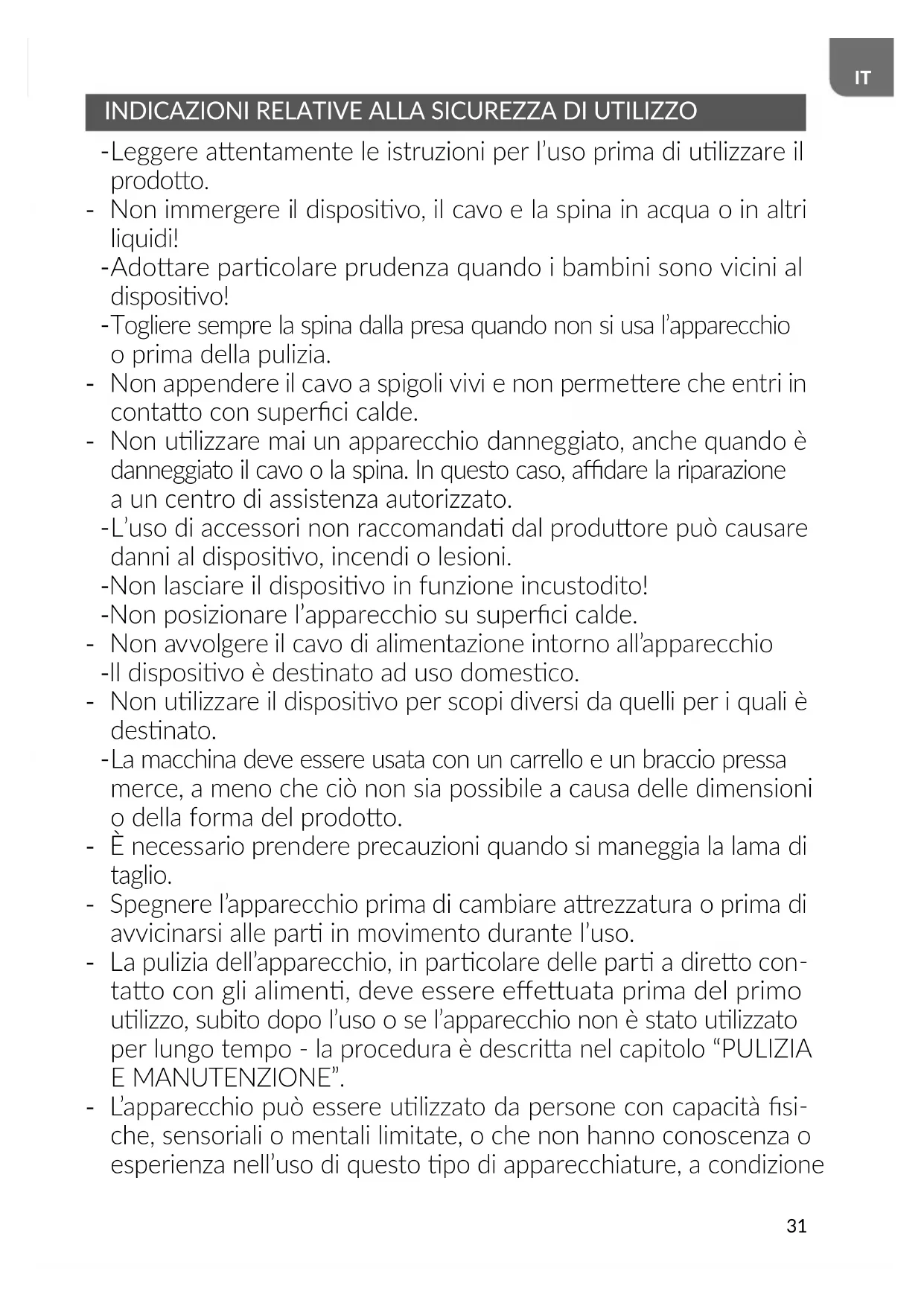 La macchina deve essere usata con un carrello e un braccio pressa merce, a meno che ciò non sia possibile a causa delle dimensioni o della forma del prodoo. - È necessario prendere precauzioni quando si maneggia la lama di taglio. - Spegnere l’apparecchio prima di cambiare arezzatura o prima di avvicinarsi alle par in movimento durante l’uso. - La pulizia dell’apparecchio, in parcolare delle par a direo con