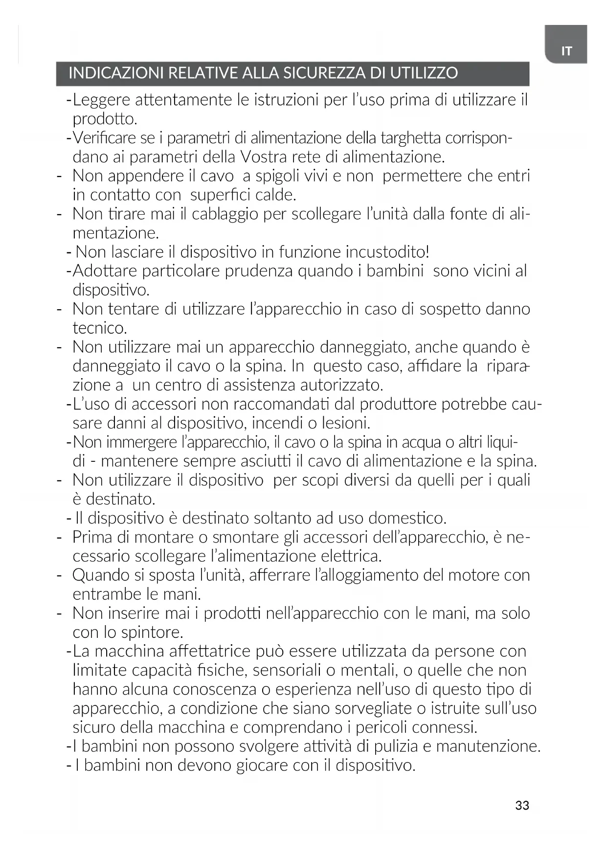 Assicurarsi sempre che tue le par dell’apparecchio siano montate correamente prima di iniziare le avità. - È vietato ulizzare il disposivo all’aperto. - Non posizionare l’apparecchio su superci calde. - Non estrarre la spina dalla presa di corrente rando il cavo. - Non collegare la spina alla presa di corrente con le mani bagnate. - Per la sicurezza dei bambini, si prega di non lasciare par dell’im