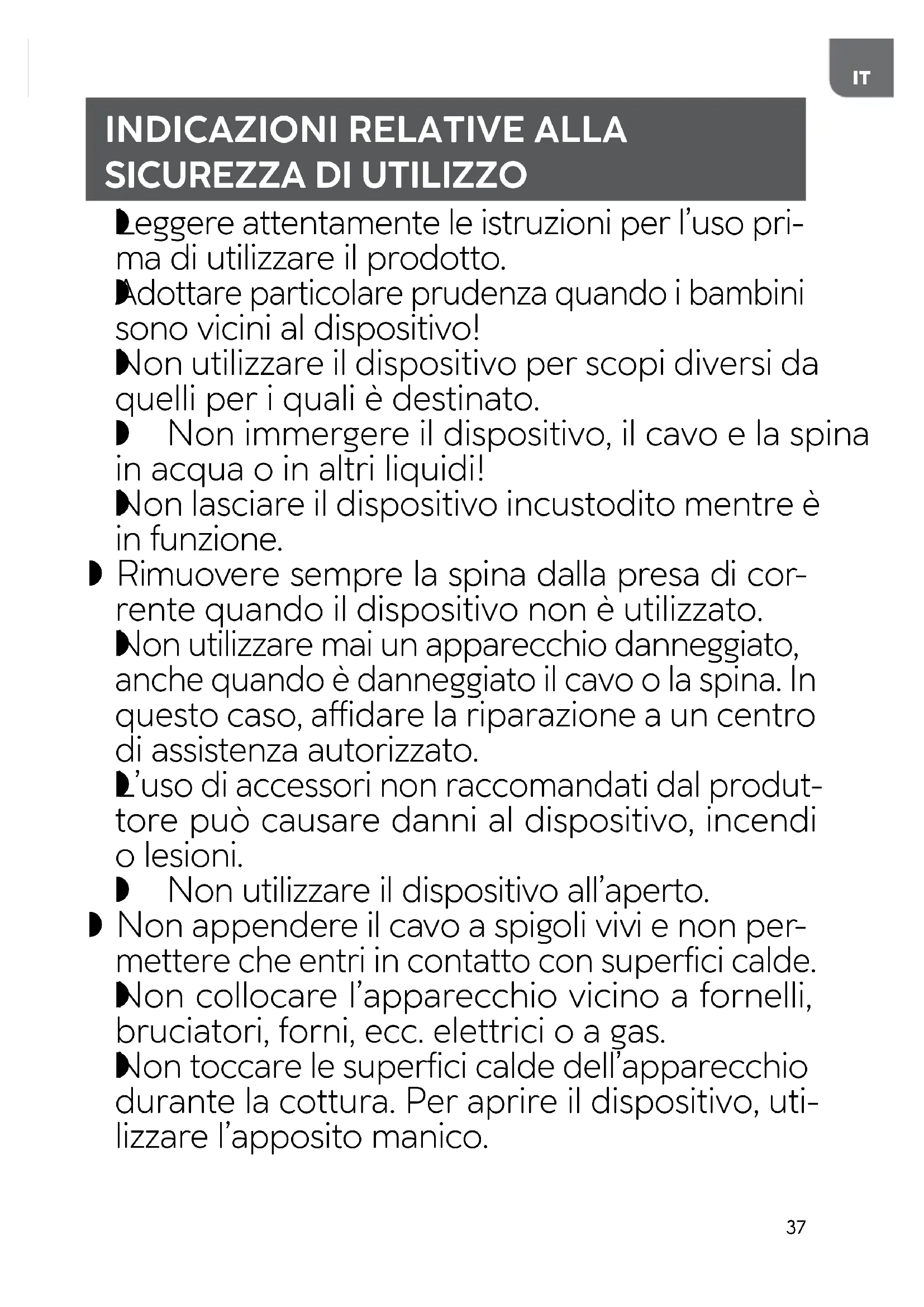 Non utilizzare il dispositivo per scopi diversi da quelli per i quali è destinato. Non immergere il dispositivo, il cavo e la spina in acqua o in altri liquidi!