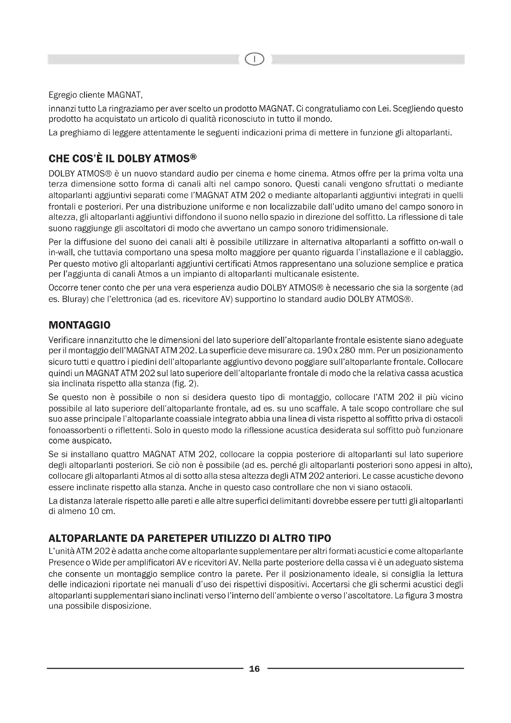 DOLBY ATMOS® è un nuovo standard audio per cinema e home cinema. Atmos offre per la prima volta una terza dimensione sotto forma di canali alti nel campo sonoro. Questi canali vengono sfruttati o mediante altoparlanti aggiuntivi separati come l’MAGNAT ATM 202 o mediante altoparlanti aggiuntivi integrati in quelli frontali e posteriori. Per una distribuzione uniforme e non localizzabile dall’udito umano del campo sonoro in altezza, gli altoparlanti aggiuntivi diffondono il suono nello spazio in direzione del soffitto. La riflessione di tale suono raggiunge gli ascoltatori di modo che avvertano un campo sonoro tridimensionale. Per la diffusione del suono dei canali alti è possibile utilizzare in alternativa altoparlanti a soffitto on-wall o in-wall, che tuttavia comportano una spesa molto maggiore per quanto riguarda l’installazione e il cablaggio. Per questo motivo gli altoparlanti aggiuntivi certificati Atmos rappresentano una soluzione semplice e pratica per l’aggiunta di canali Atmos a un impianto di altoparlanti multicanale esistente. Occorre tener conto che per una vera esperienza audio DOLBY ATMOS® è necessario che sia la sorgente (ad es. Bluray) che l’elettronica (ad es. ricevitore AV) supportino lo standard audio DOLBY ATMOS®. MONTAGGIO Verificare innanzitutto che le dimensioni del lato superiore dell’altoparlante frontale esistente siano adeguate per il montaggio dell’MAGNAT ATM 202. La superficie deve misurare ca. 190 x 280 mm. Per un posizionamento sicuro tutti e quattro i piedini dell’altoparlante aggiuntivo devono poggiare sull’altoparlante frontale. Collocare quindi un MAGNAT ATM 202 sul lato superiore dell’altoparlante frontale di modo che la relativa cassa acustica sia inclinata rispetto alla stanza (fig. 2). Se questo non è possibile o non si desidera questo tipo di montaggio, collocare l’ATM 202 il più vicino possibile al lato superiore dell’altoparlante frontale, ad es. su uno scaffale. A tale scopo controllare che sul suo asse principale l’altoparlante coassiale integrato abbia una linea di vista rispetto al soffitto priva di ostacoli fonoassorbenti o riflettenti. Solo in questo modo la riflessione acustica desiderata sul soffitto può funzionare come auspicato. Se si installano quattro MAGNAT ATM 202, collocare la coppia posteriore di altoparlanti sul lato superiore degli altoparlanti posteriori. Se ciò non è possibile (ad es. perché gli altoparlanti posteriori sono appesi in alto), collocare gli altoparlanti Atmos al di sotto alla stesa altezza degli ATM 202 anteriori. Le casse acustiche devono essere inclinate rispetto alla stanza. Anche in questo caso controllare che non vi siano ostacoli. La distanza laterale rispetto alle pareti e alle altre superfici delimitanti dovrebbe essere per tutti gli altoparlanti di almeno 10 cm. ALTOPARLANTE DA PARETEPER UTILIZZO DI ALTRO TIPO L’unità ATM 202 è adatta anche come altoparlante supplementare per altri formati acustici e come altoparlante Presence o Wide per amplificatori AV e ricevitori AV. Nella parte posteriore della cassa vi è un adeguato sistema che consente un montaggio semplice contro la parete. Per il posizionamento ideale, si consiglia la lettura delle indicazioni riportate nei manuali d’uso dei rispettivi dispositivi. Accertarsi che gli schermi acustici degli altoparlanti supplementari siano inclinati verso l’interno dell’ambiente o verso l’ascoltatore. La figura 3 mostra una possibile disposizione.17 Avviso importante/avvertenza di sicurezza: Per l’utilizzo di sostegni a parete / fissaggi degli altoparlanti e per il fissaggio del trasmettitore alla parete è ritenuto responsabile il cliente. Il cliente è allo stesso modo responsabile per il fissaggio sicuro del sostegno dell’altoparlante alla parete e per la scelta del materiale di montaggio adatto (ad es. viti, tasselli) considerando il peso e la costruzione degli altoparlanti e la qualità della parete.