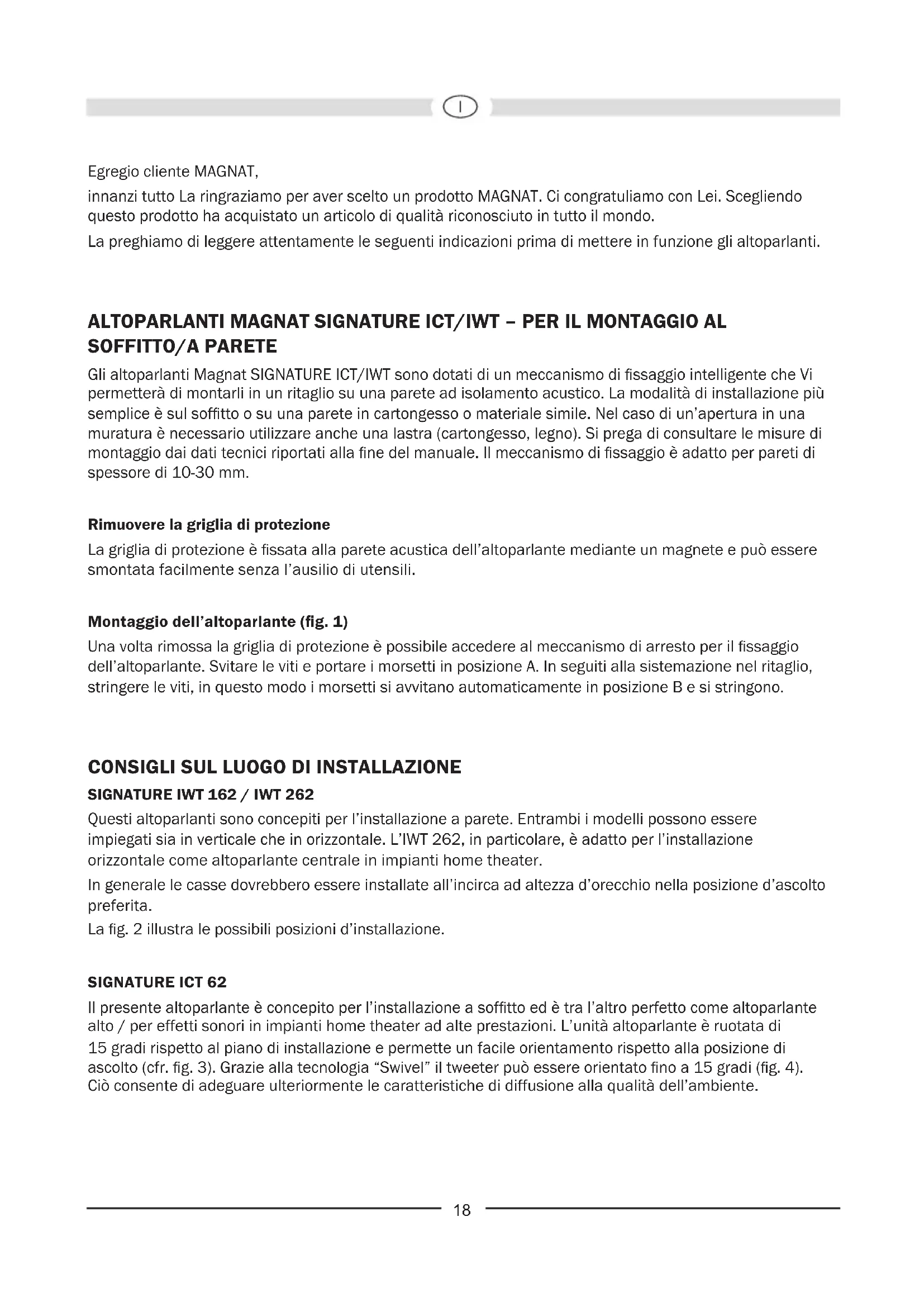 Egregio cliente MAGNAT, innanzi tutto La ringraziamo per aver scelto un prodotto MAGNAT. Ci congratuliamo con Lei. Scegliendo questo prodotto ha acquistato un articolo di qualità riconosciuto in tutto il mondo. La preghiamo di leggere attentamente le seguenti indicazioni prima di mettere in funzione gli altoparlanti. ALTOPARLANTI MAGNAT SIGNATURE ICT/IWT – PER IL MONTAGGIO AL