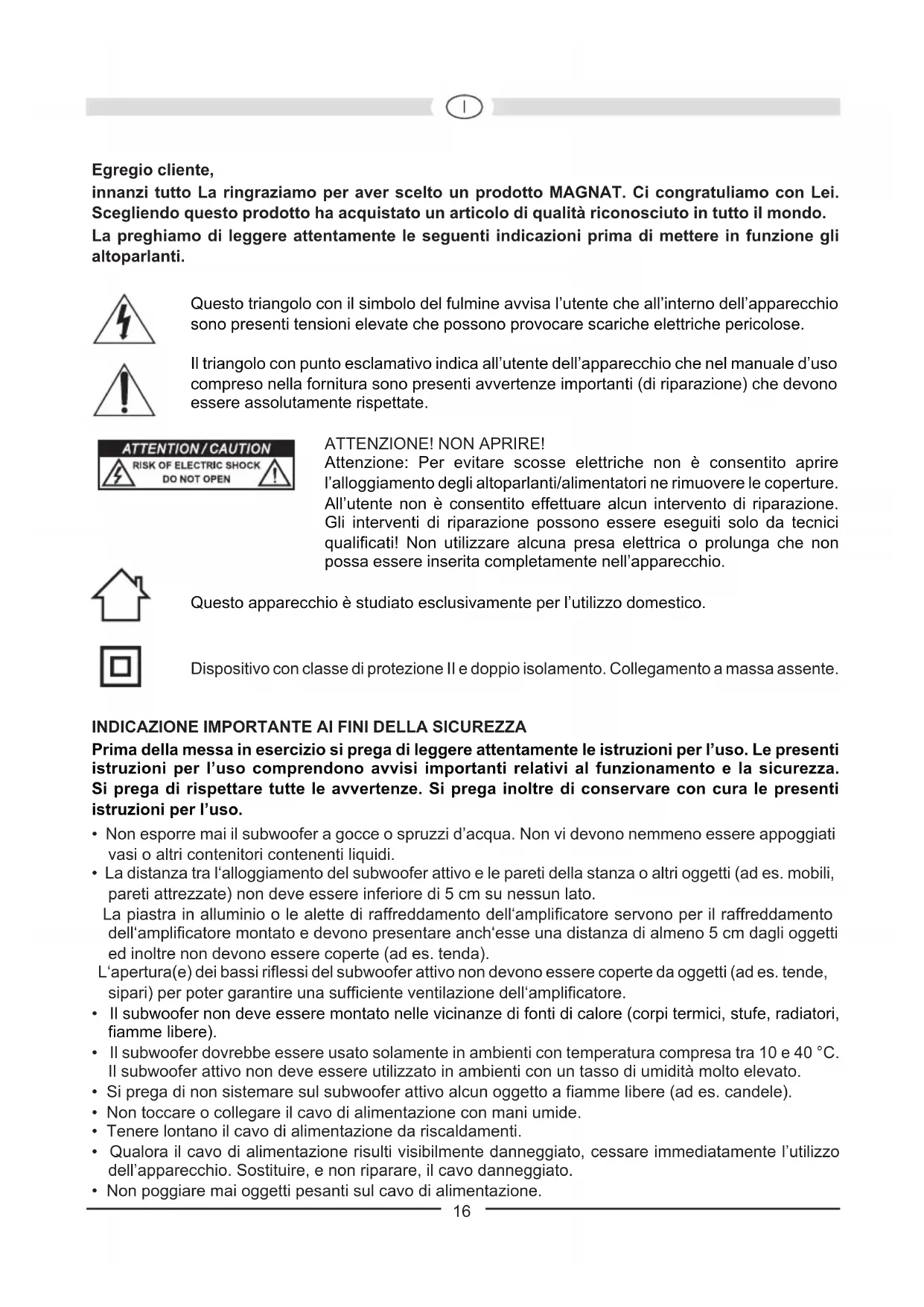 Egregio cliente, innanzi tutto La ringraziamo per aver scelto un prodotto MAGNAT. Ci congratuliamo con Lei. Scegliendo questo prodotto ha acquistato un articolo di qualità riconosciuto in tutto il mondo. La preghiamo di leggere attentamente le seguenti indicazioni prima di mettere in funzione gli altoparlanti. Questo triangolo con il simbolo del fulmine avvisa l’utente che all’interno dell’apparecchio sono presenti tensioni elevate che possono provocare scariche elettriche pericolose. Il triangolo con punto esclamativo indica all’utente dell’apparecchio che nel manuale d’uso compreso nella fornitura sono presenti avvertenze importanti (di riparazione) che devono essere assolutamente rispettate. ATTENZIONE! NON APRIRE! Attenzione: Per evitare scosse elettriche non è consentito aprire l’alloggiamento degli altoparlanti/alimentatori ne rimuovere le coperture. All’utente non è consentito effettuare alcun intervento di riparazione. Gli interventi di riparazione possono essere eseguiti solo da tecnici qualificati! Non utilizzare alcuna presa elettrica o prolunga che non possa essere inserita completamente nell’apparecchio. Questo apparecchio è studiato esclusivamente per l’utilizzo domestico. Dispositivo con classe di protezione II e doppio isolamento. Collegamento a massa assente.