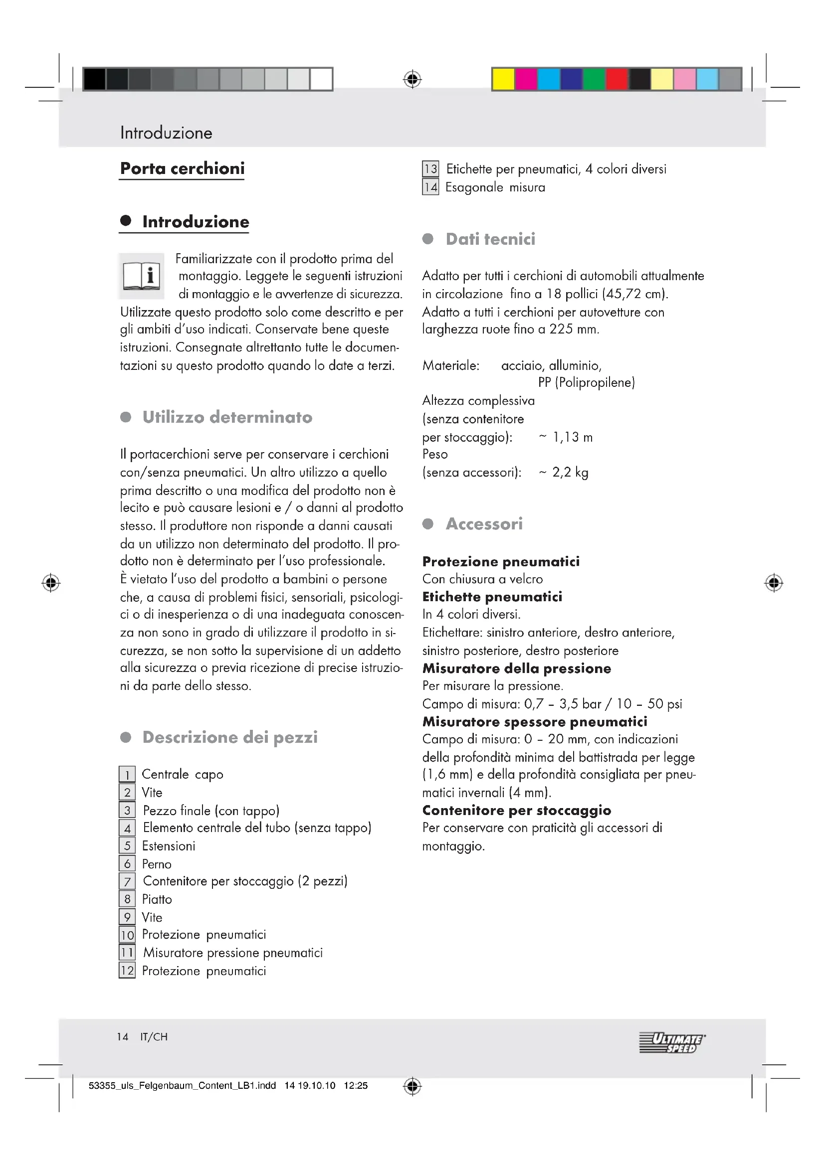 Accessori Protezione pneumatici Con chiusura a velcro Etichette pneumatici In 4 colori diversi. Etichettare: sinistro anteriore, destro anteriore, sinistro posteriore, destro posteriore Misuratore della pressione Per misurare la pressione. Campo di misura: 0,7 – 3,5 bar / 10 – 50 psi Misuratore spessore pneumatici Campo di misura: 0 – 20 mm, con indicazioni della profondità minima del battistrada per legge (1,6 mm) e della profondità consigliata per pneu- matici invernali (4 mm). Contenitore per stoccaggio Per conservare con praticità gli accessori di montaggio. 53355_uls_Felgenbaum_Content_LB1.indd 14 19.10.10 12:2515 IT/CH Norme ... / Montaggio / Istruzioni per l‘uso degli ... / Cura e manutenzione Norme di sicurezza