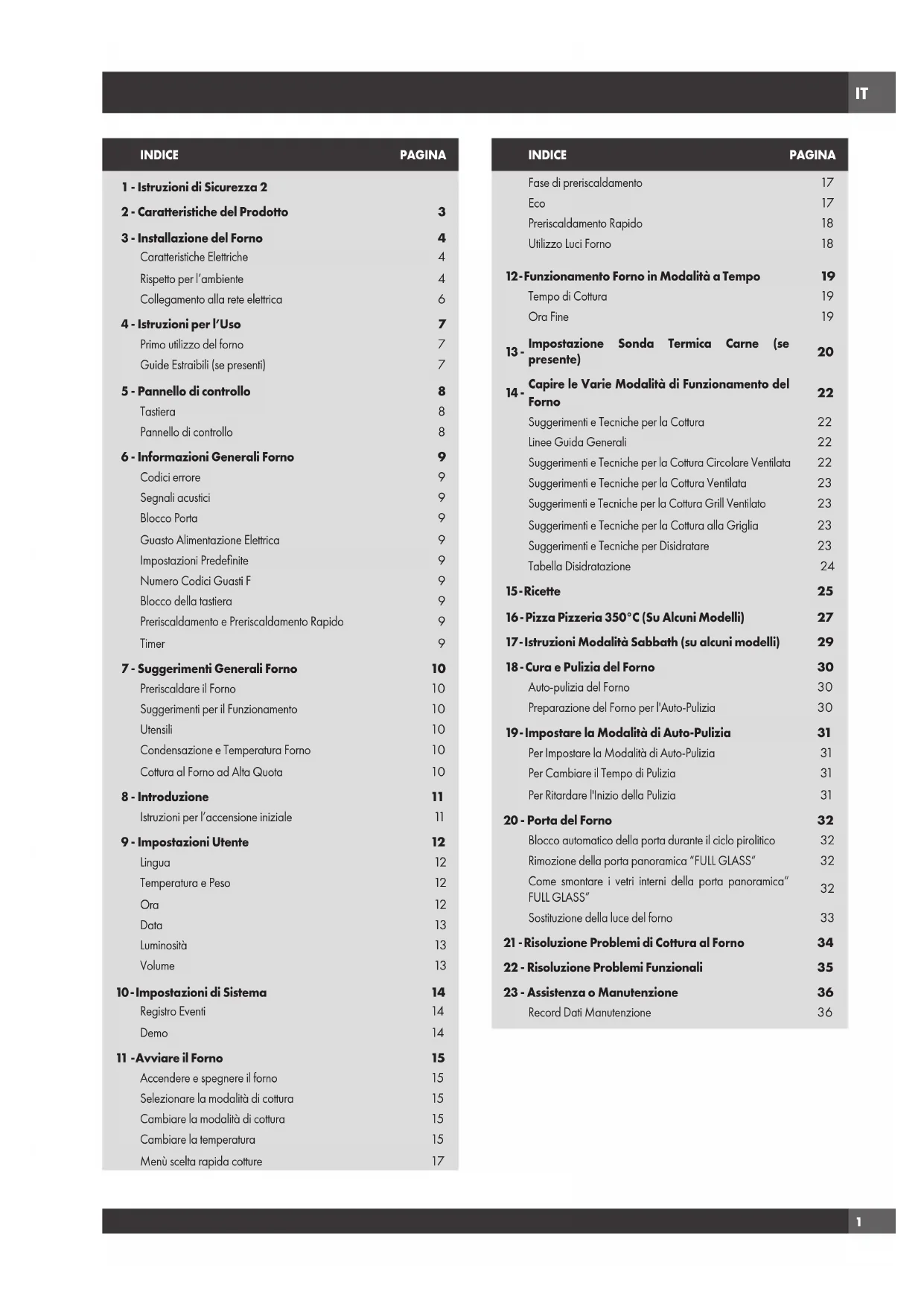 Per l’installazione del forno nella cucina, praticare un vano di incasso secondo le dimensioni indicate nella figura Vani da Incasso e Dimensioni. L’apparecchio deve essere fissato al mobile sopra tramite le due viti fornite in dotazione nel kit, attraverso i fori praticati sui montanti del forno. ATTENZIONE Poiché questo apparecchio è inserito nei mobili della cucina, assicurarsi che ciascuna superficie a contatto con il forno resista ad una temperatura di circa 90°C. Caratteristiche Elettriche Potenza assorbita: resistenza superiore forno: 1200+1000W 1200+1000W 230V 240V resistenza inferiore forno: 1100W 1100W 230V 240V elemento circolare (aria calda): 2300W 2300W 230V 240V (su alcuni modelli) motore gira-arrosto: 4W (su alcuni modelli) lampada: 25W motore ventola aria calda: 25W motore ventola di raffreddamento: 25W Potenza massima assorbita: (vedere la targhetta) Tensione di alimentazione: (vedere la targhetta) Rispetto per l’ambiente La documentazione del presente elettrodomestico utilizza carta sbiancata senza cloro oppure carta riciclata allo scopo di contribuire alla tutela dell’ambiente. Gli imballaggi sono concepiti per evitare di danneggiare l’ambiente; sono prodotti ecologici che possono essere recuperati o riciclati. Riciclando l’imballaggio, si contribuirà ad un risparmio di materie prime e ad una riduzione del volume degli scarti industriali e domestici. IL MATERIALE DI IMBALLAGGIO è riciclabile al 100% ed è contrassegnato dal simbolo del riciclaggio. Per lo smaltimento seguire le normative locali. Il materiale di imballaggio (sacchetti di plastica, parti in polistirolo, ecc.) deve essere tenuto fuori dalla portata dei bambini in quanto potenzialmente pericoloso. QUESTO ELETTRODOMESTICO è contrassegnato in conformità alla Direttiva Europea 2012/96/UE, Rifiuti di Apparecchiature Elettriche ed Elettroniche (RAEE). Assicurandosi che questo prodotto venga smaltito in modo corretto, l’utente contribuisce a prevenire potenziali conseguenze negative per l’ambiente e la salute. IL SIMBOLO sul prodotto o sulla documentazione di accompagnamento indica che questo prodotto non deve essere trattato come rifiuto domestico, ma deve essere consegnato presso l’idoneo punto di raccolta per il riciclaggio di apparecchiature elettriche ed elettroniche.IT