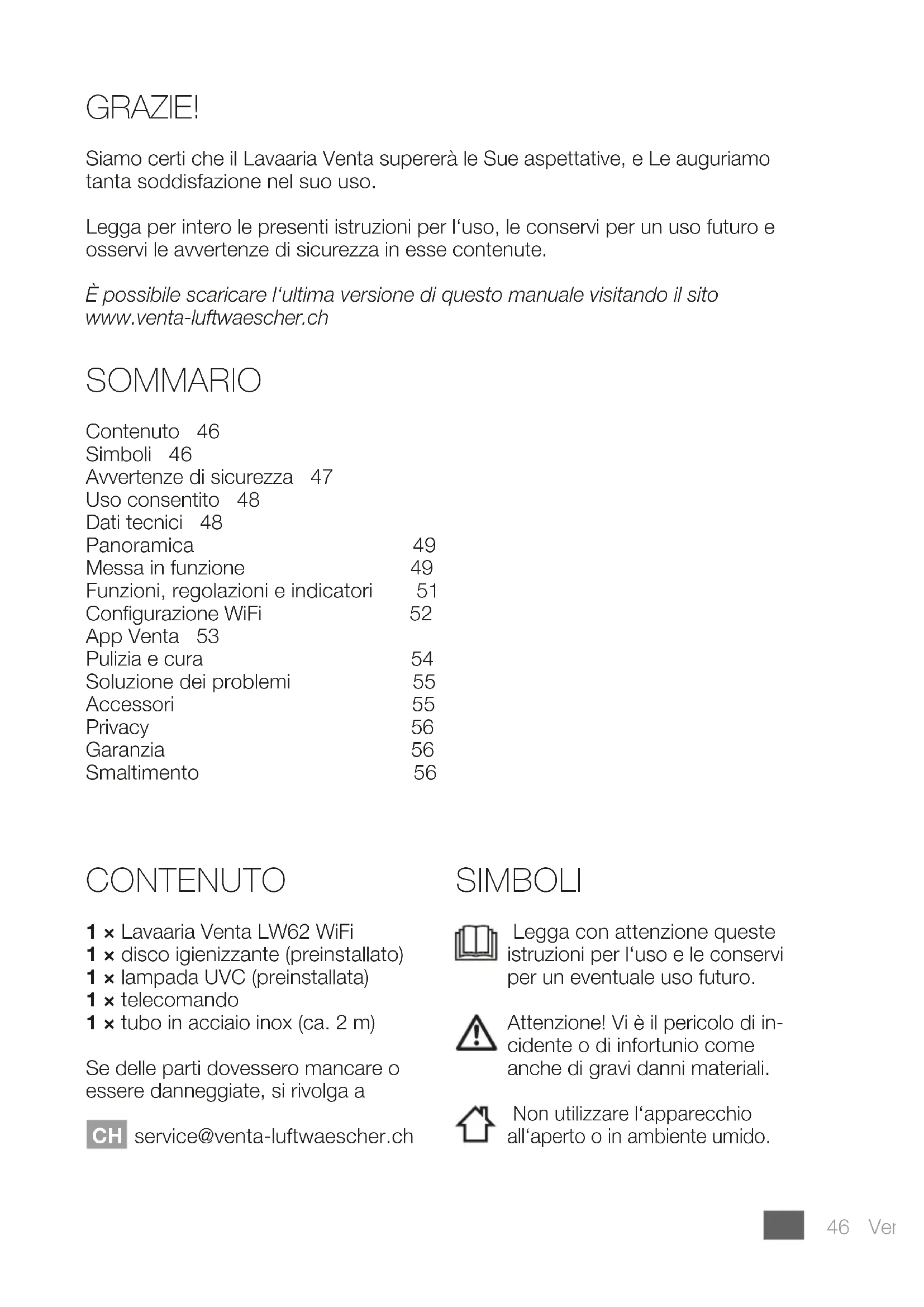Problema Possibile soluzione L‘apparecchio non funziona. Inlare la spina elettrica nella presa. Inserire il connettore del cavo di alimentazione nell‘apparecchio. Se con l‘ausilio delle informazioni fornite non dovesse essere possibile risolvere il problema, rivolgersi al servizio di assistenza clienti VENTA: +41 41 781 1515, service@venta-luftwaescher.ch ACCESSORI Articolo Unità di imballaggio / Pz. Disco Disco igienizzante 1 / 3 Detergente Detergente per apparecchi VENTA 1 Lampada UVC 1 Gli accessori possono essere ordinati telefonicamente oppure online. +41 41 781 1515, service@venta-luftwaescher.ch56ITVenta LW62 WiFi PRIVACY I Suoi dati vengono trattati dalla Venta Luftwäscher in maniera riservata. Se i Suoi dati personali dovessero subire modiche o in caso di quesiti su come elaboria- mo i Suoi dati, si rivolga al servizio di assistenza clienti Venta: CH: +41 41 781 1515, service@venta-luftwaescher.ch Per maggiori informazioni sul tema Privacy può consultare le nostre direttive sulla privacy al sito www.venta-luftwaescher.ch GARANZIA L‘eccellente qualità del prodotto consente a Venta Luftwäscher GmbH di fornire una garanzia di due anni dalla data di acquisto, assicurando l‘assenza di difetti in presenza di un utilizzo appropriato. Laddove tuttavia dovessero occasionalmente presentarsi difetti nei materiali o nella lavorazione, si prega di rivolgersi al servizio di assistenza VENTA o al proprio rivenditore. Si applicano inoltre in tali casi le con- dizioni generali di garanzia Venta, consultabili all‘indirizzo: www.venta-luftwaescher.ch/service/garantie/ SMALTIMENTO Il simbolo „pattumiera barrata“ richiede uno smaltimento separato di apparecchi elettrici ed elettronici usati (WEEE) come anche delle batterie/ pile esauste. Simili apparecchi possono contenere sostanze pericolose e dannose per l‘ambiente. Questi prodotti devono essere smaltiti presso un punto di raccolta per il riciclaggio di apparecchi elettrici ed elettronici e non devo- no essere smaltiti nei normali riuti domestici. Le batterie esauste non devono essere gettate nei riuti domestici. Esse devono essere conferite ai centri di raccol- ta o ai rivenditori. Così facendo si contribuisce alla protezione e alla salvaguardia delle risorse e dell‘ambiente.Per ulteriori informazioni rivolgersi agli enti preposti locali. In nessun caso i bambini devono giocare con sacchetti di plastica e materiale di imballaggio, in quanto vi è pericolo di infortunio o di soocamento. Conservare simile materiale in maniera sicura oppure smaltirlo in maniera ecosostenibile.Art.-Nr. 2910101, Druckdatum © 2020/07_V01 GERMANY Venta-Luftwäscher GmbH Weltestr. 5 D-88250 Weingarten Tel.: +49 751 50 08 88 Fax: +49 751 50 08 20 service@venta-luftwaescher.de www.venta-luftwaescher.de SWITZERLAND Venta-Luftwäscher AG Bösch 65 CH-6331 Hünenberg Tel.: +41 41 781 15 15 Fax: +41 41 781 15 50 info@venta-luftwaescher.ch www.venta-luftwaescher.ch AUSTRIA Venta-Austria GmbH Färbergasse 15 6850 Dornbirn Tel.: +43 5572 202 539 Fax.: +43 5572 202 537 oce@venta.at www.venta.at