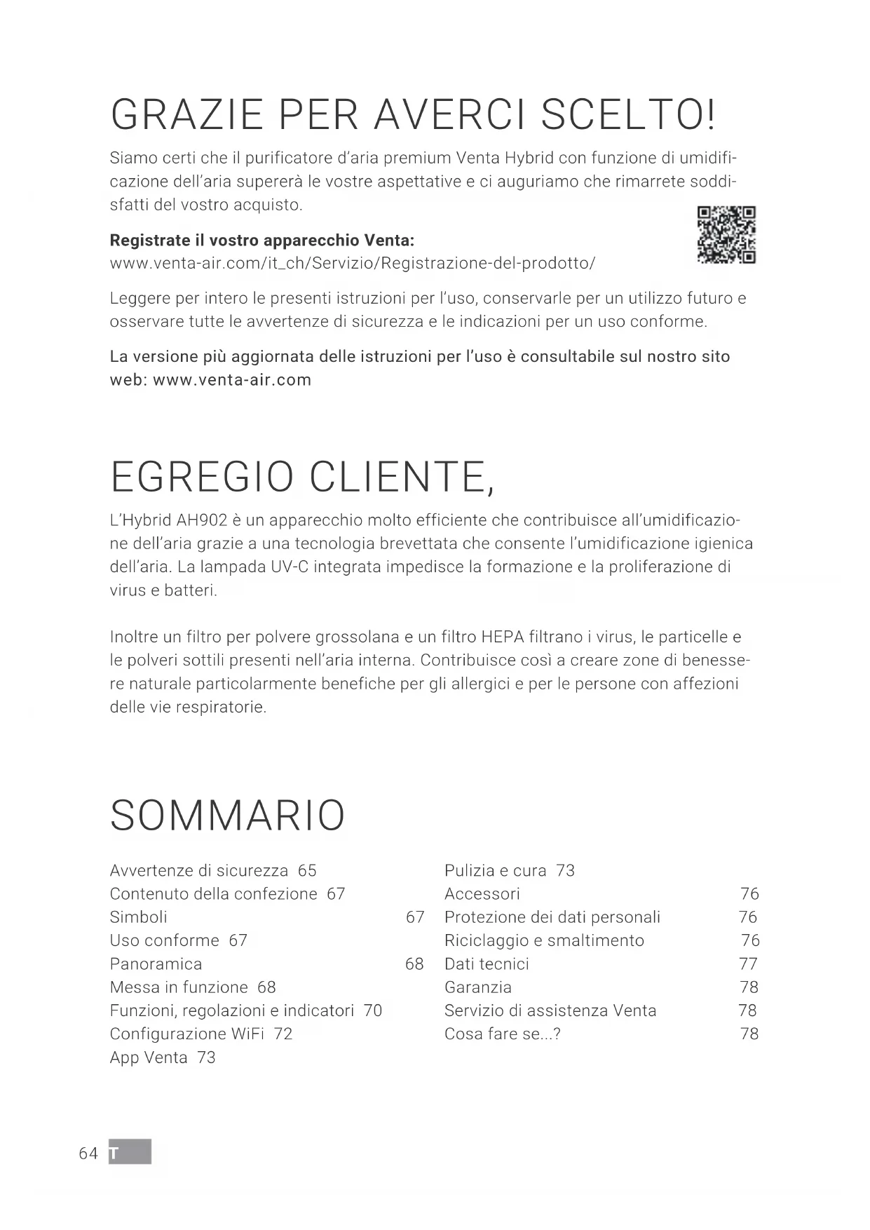 Si es preciso, actualice el sistema operativo de su teléfono móvil o tableta.64 IT GRAZIE PER AVERCI SCELTO! Siamo certi che il purificatore d’aria premium Venta Hybrid con funzione di umidifi- cazione dell’aria supererà le vostre aspettative e ci auguriamo che rimarrete soddi- sfatti del vostro acquisto. Registrate il vostro apparecchio Venta: www.venta-air.com/it_ch/Servizio/Registrazione-del-prodotto/ Leggere per intero le presenti istruzioni per l’uso, conservarle per un utilizzo futuro e osservare tutte le avvertenze di sicurezza e le indicazioni per un uso conforme. La versione più aggiornata delle istruzioni per l’uso è consultabile sul nostro sito web: www.venta-air.com EGREGIO CLIENTE, L’Hybrid AH902 è un apparecchio molto efficiente che contribuisce all’umidificazio- ne dell’aria grazie a una tecnologia brevettata che consente l’umidificazione igienica dell’aria. La lampada UV-C integrata impedisce la formazione e la proliferazione di virus e batteri. Inoltre un filtro per polvere grossolana e un filtro HEPA filtrano i virus, le particelle e le polveri sottili presenti nell’aria interna. Contribuisce così a creare zone di benesse- re naturale particolarmente benefiche per gli allergici e per le persone con affezioni delle vie respiratorie. SOMMARIO Avvertenze di sicurezza 65 Contenuto della confezione 67 Simboli 67 Uso conforme 67 Panoramica 68 Messa in funzione 68 Funzioni, regolazioni e indicatori 70 Configurazione WiFi 72 App Venta 73 Pulizia e cura 73 Accessori 76 Protezione dei dati personali 76 Riciclaggio e smaltimento 76 Dati tecnici 77 Garanzia 78 Servizio di assistenza Venta 78 Cosa fare se...? 7865IT
