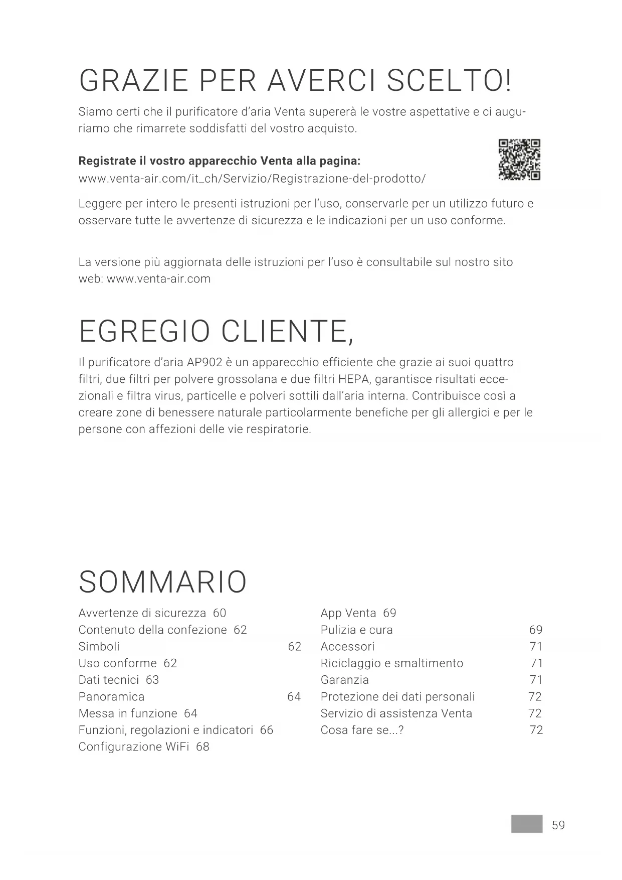 Werk indien nodig het besturingssysteem van uw smartphone of tablet bij.59IT GRAZIE PER AVERCI SCELTO! Siamo certi che il purificatore d’aria Venta supererà le vostre aspettative e ci augu- riamo che rimarrete soddisfatti del vostro acquisto. Registrate il vostro apparecchio Venta alla pagina: www.venta-air.com/it_ch/Servizio/Registrazione-del-prodotto/ Leggere per intero le presenti istruzioni per l’uso, conservarle per un utilizzo futuro e osservare tutte le avvertenze di sicurezza e le indicazioni per un uso conforme. La versione più aggiornata delle istruzioni per l’uso è consultabile sul nostro sito web: www.venta-air.com EGREGIO CLIENTE, Il purificatore d’aria AP902 è un apparecchio efficiente che grazie ai suoi quattro filtri, due filtri per polvere grossolana e due filtri HEPA, garantisce risultati ecce- zionali e filtra virus, particelle e polveri sottili dall’aria interna. Contribuisce così a creare zone di benessere naturale particolarmente benefiche per gli allergici e per le persone con affezioni delle vie respiratorie. SOMMARIO Avvertenze di sicurezza 60 Contenuto della confezione 62 Simboli 62 Uso conforme 62 Dati tecnici 63 Panoramica 64 Messa in funzione 64 Funzioni, regolazioni e indicatori 66 Configurazione WiFi 68 App Venta 69 Pulizia e cura 69 Accessori 71 Riciclaggio e smaltimento 71 Garanzia 71 Protezione dei dati personali 72 Servizio di assistenza Venta 72 Cosa fare se...? 7260 IT