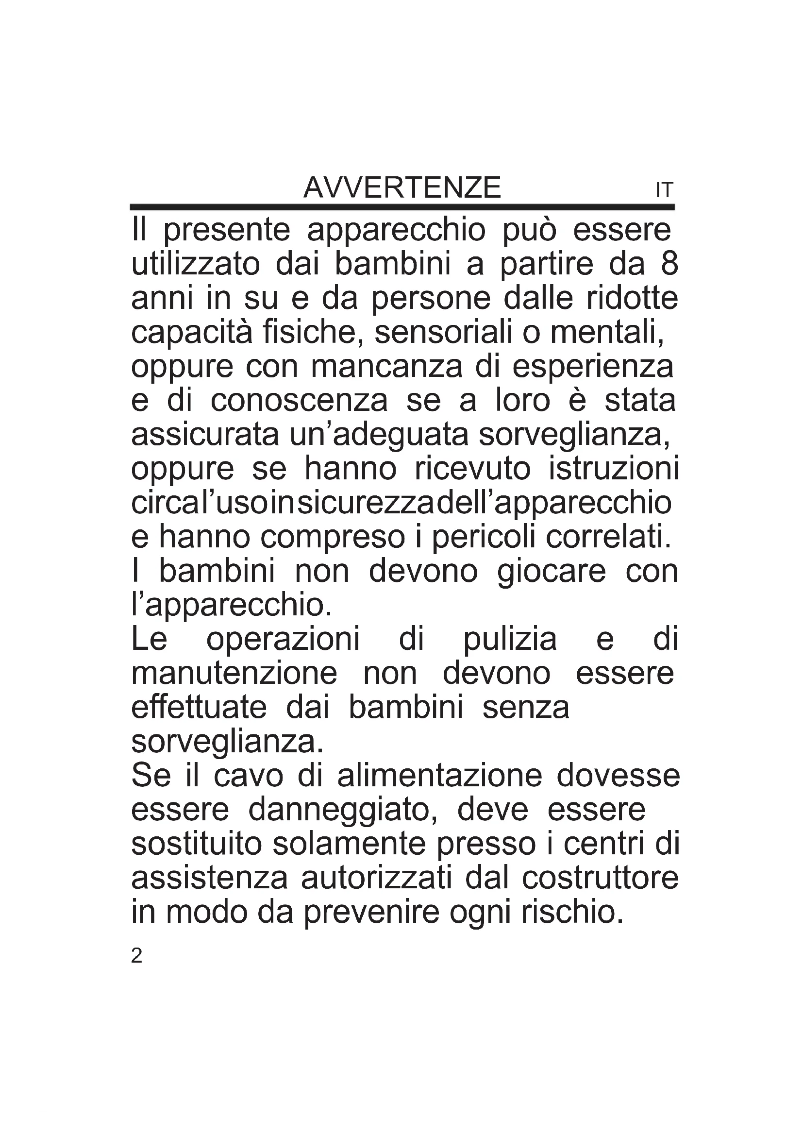 Il presente apparecchio può essere utilizzato dai bambini a partire da 8 anni in su e da persone dalle ridotte capacità siche, sensoriali o mentali, oppure con mancanza di esperienza e di conoscenza se a loro è stata assicurata un’adeguata sorveglianza, oppure se hanno ricevuto istruzioni circa l’uso in sicurezza dell’apparecchio e hanno compreso i pericoli correlati. I bambini non devono giocare con l’apparecchio. Le operazioni di pulizia e di manutenzione non devono essere eettuate dai bambini senza sorveglianza. Se il cavo di alimentazione dovesse essere danneggiato, deve essere sostituito solamente presso i centri di assistenza autorizzati dal costruttore in modo da prevenire ogni rischio.3 ATTENZIONE: leggere attentamente il presente libretto in quanto contiene importanti istruzioni per la sicurezza di installazione, uso e manutenzione. Istruzioni importanti da conservare per riferimenti futuri. I bambini NON devono giocare con il dispositivo. Questo apparecchio dovrà essere destinato solo all’uso per il quale è stato espressamente concepito; qualsiasi impiego non conforme alle indicazioni contenute nel presente manuale è da considerarsi improprio e pericoloso. Il produttore non può essere ritenuto responsabile per eventuali danni derivanti da utilizzo improprio e/o irragionevole. Questo apparecchio NON è idoneo per impiego in ambienti con atmosfere esplosive (con presenza di sostanze inammabili sotto forma di gas, vapore, nebbia o polvere, in condizioni atmosferiche in cui, dopo l’accensione, la combustione si propaga nell’aria). Gli elementi dell’imballaggio (sacchetti in plastica, polistirolo espanso, etc.) non devono essere lasciati alla portata di bambini o incapaci in quanto rappresentano potenziali fonti di pericolo. L’installazione/assemblaggio del dispositivo dovrà essere eettuata/o secondo le prescrizioni del costruttore. Una errata procedura può causare danni a persone, animali o cose, per i quali il costruttore non può essere ritenuto responsabile. Posizionare ed utilizzare l’apparecchio su un piano d’appoggio orizzontale e stabile. Prima di utilizzare l’apparecchio vericare visivamente l’integrità del medesimo e del suo cavo di alimentazione. In caso di dubbi rivolgersi a personale qualicato. Assicurarsi che il ventilatore sia scollegato dalla rete di alimentazione prima di togliere le griglie di protezione. Non collegare l’apparecchio all’alimentazione e non utilizzarlo se non è completamente montato (vedi istruzioni di montaggio).4 Prima di alimentare l’apparecchio accertarsi che i suoi dati di targa (tensione e frequenza) siano rispondenti a quelli della rete di distribuzione elettrica e che la presa sia idonea al terminale del cavo di cui l’apparecchio è dotato. Vericare che l’impianto elettrico utilizzato per l’alimentazione sia dotato delle adeguate protezioni a norma delle leggi in vigore. NON alimentare l’apparecchio mediante prese multiple. Evitare se possibile l’impiego di adattatori e/o prolunghe; qualora il loro impiego si rendesse indispensabile utilizzare esclusivamente materiale conforme alle vigenti norme di sicurezza e nel rispetto dei parametri elettrici degli adattatori in questione. L’apparecchio non deve essere acceso mediante temporizzatori esterni e/o altri dispositivi di controllo remoto non espressamente previsti dal presente manuale. NON utilizzare né conservare il dispositivo in prossimità di fonti di calore localizzate (caloriferi, stufe etc.). NON immergere l’apparecchio in acqua o altri liquidi; in caso di caduta accidentalmente in acqua NON cercare di recuperarlo ma innanzitutto scollegare immediatamente il cavo di alimentazione dalla presa elettrica. Utilizzando l’apparecchio per la prima volta, assicurarsi di aver tolto ogni etichetta o foglio di protezione che ne impedisca il corretto funzionamento. Collegare e scollegare il cavo di alimentazione con le mani asciutte e reggendolo saldamente. Prima di inserire la spina nella presa di corrente assicurarsi che il pulsante di avviamento dell’apparecchio sia in posizione “OFF” (spento). Svolgere sempre totalmente il cavo di alimentazione onde evitare surriscaldamenti, evitare in ogni caso di tenderlo (non tirarlo, strattonarlo, né utilizzarlo per trascinare il dispositivo cui è collegato). Evitare di posizionare il cavo di alimentazione su superci abrasive o taglienti o comunque in posizioni dove può essere facilmente danneggiato. NON ostruire né totalmente né parzialmente le prese d’aria nè inserirvi oggetti all’interno. Durante il funzionamento non toccare il dispositivo con parti del corpo bagnate o umide, in ogni caso si consiglia di interporre fra se e il piano di appoggio un elemento isolante (ad esempio indossando scarpe con suola in gomma). Durante l’uso l’apparecchio deve essere tenuto a distanza di sicurezza da qualsiasi oggetto e/o sostanza inammabile o potenzialmente esplosiva. In caso di funzionamento anomalo o di anomalie durante il funzionamento spegnere subito l’apparecchio, scollegarlo dall’alimentazione, vericare le cause delle anomalie riscontrate eventualmente con l’aiuto di personale qualicato. Evitare in ogni caso di eettuare operazioni non previste dal presente manuale d’uso (come smontarlo e/o modicarlo).5 Ricordarsi di scollegare sempre il cavo di alimentazione del dispositivo per periodi di inutilizzo prolungati, prima di riporlo e prima di eettuare qualsiasi operazione di pulizia o manutenzione. Conservare e utilizzare l’apparecchio esclusivamente in ambienti interni o in ogni caso protetto da agenti atmosferici come pioggia, irraggiamento diretto del sole o polvere. L’apparecchio non è progettato per l’uso o la conservazione in esterno. La pulizia e manutenzione del dispositivo NON deve essere eettuata da bambini senza la supervisione di un adulto. Prima di scollegare l’apparecchio spegnerlo mediante l’apposito comando sul pannello di controllo. Allorché si deci