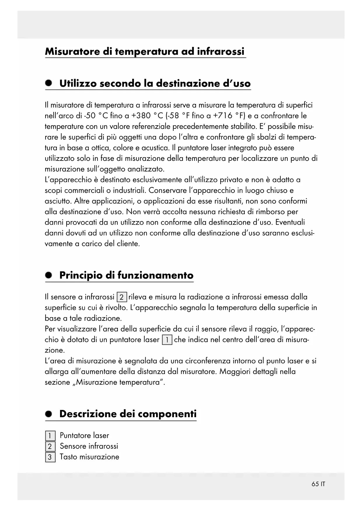 che indica nel centro dell‘area di misura- zione. L‘area di misurazione è segnalata da una circonferenza intorno al punto laser e si allarga all‘aumentare della distanza dal misuratore. Maggiori dettagli nella sezione „Misurazione temperatura“. Descrizione dei componenti