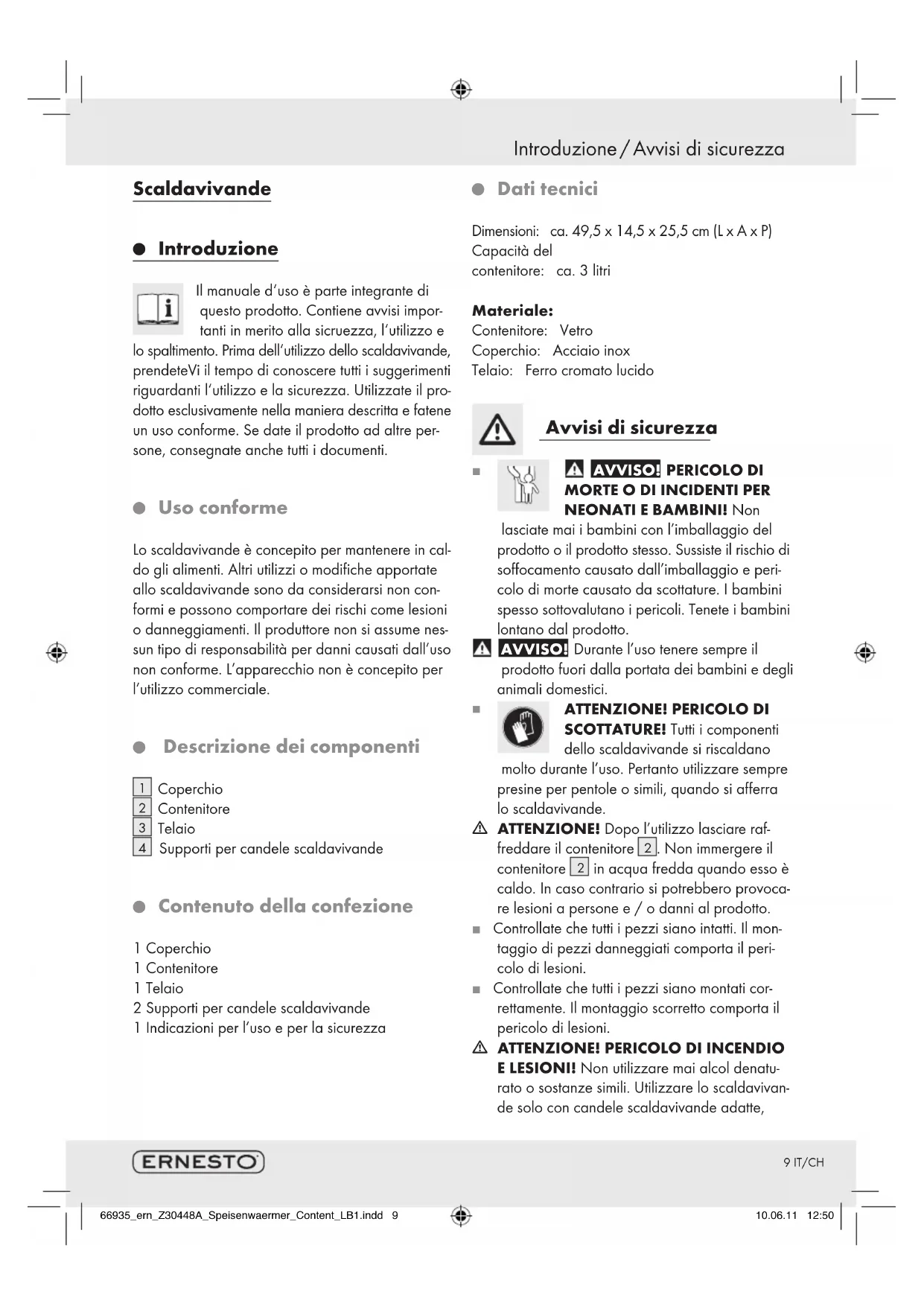 in acqua fredda quando esso è caldo. In caso contrario si potrebbero provoca- re lesioni a persone e / o danni al prodotto. J Controllate che tutti i pezzi siano intatti. Il mon- taggio di pezzi danneggiati comporta il peri- colo di lesioni. J Controllate che tutti i pezzi siano montati cor- rettamente. Il montaggio scorretto comporta il pericolo di lesioni. m ATTENZIONE! PERICOLO DI INCENDIO E LESIONI! Non utilizzare mai alcol denatu- rato o sostanze simili. Utilizzare lo scaldavivan- de solo con candele scaldavivande adatte, Introduzione / Avvisi di sicurezza 66935_ern_Z30448A_Speisenwaermer_Content_LB1.indd 9 10.06.11 12:5010 IT/CH Avvisi di sicurezza / Prima di utilizzare il prodotto per la prima volta / Utilizzo comunemente reperibili in commercio.