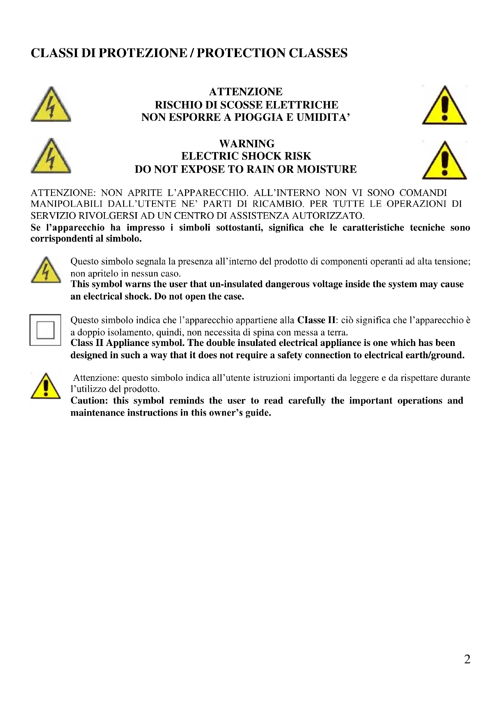 DO NOT EXPOSE TO RAIN OR MOISTURE ATTENZIONE: NON APRITE L’APPARECCHIO. ALL’INTERNO NON VI SONO COMANDI MANIPOLABILI DALL’UTENTE NE’ PARTI DI RICAMBIO. PER TUTTE LE OPERAZIONI DI SERVIZIO RIVOLGERSI AD UN CENTRO DI ASSISTENZA AUTORIZZATO. Se l’apparecchio ha impresso i simboli sottostanti, significa che le caratteristiche tecniche sono corrispondenti al simbolo. Questo simbolo segnala la presenza all’interno del prodotto di componenti operanti ad alta tensione; non apritelo in nessun caso. This symbol warns the user that un-insulated dangerous voltage inside the system may cause an electrical shock. Do not open the case. Questo simbolo indica che l’apparecchio appartiene alla CIasse II: ciò significa che l’apparecchio è a doppio isolamento, quindi, non necessita di spina con messa a terra. Class II Appliance symbol. The double insulated electrical appliance is one which has been designed in such a way that it does not require a safety connection to electrical earth/ground. Attenzione: questo simbolo indica all’utente istruzioni importanti da leggere e da rispettare durante l’utilizzo del prodotto. Caution: this symbol reminds the user to read carefully the important operations and maintenance instructions in this owner’s guide.3