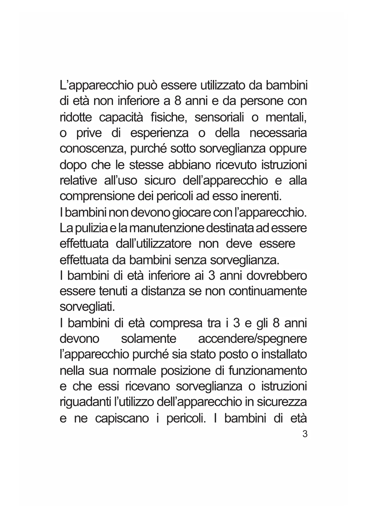 L’apparecchio può essere utilizzato da bambini di età non inferiore a 8 anni e da persone con ridotte capacità siche, sensoriali o mentali, o prive di esperienza o della necessaria conoscenza, purché sotto sorveglianza oppure dopo che le stesse abbiano ricevuto istruzioni relative all’uso sicuro dell’apparecchio e alla comprensione dei pericoli ad esso inerenti. I bambini non devono giocare con l’apparecchio. La pulizia e la manutenzione destinata ad essere eettuata dall’utilizzatore non deve essere eettuata da bambini senza sorveglianza. I bambini di età inferiore ai 3 anni dovrebbero essere tenuti a distanza se non continuamente sorvegliati. I bambini di età compresa tra i 3 e gli 8 anni devono solamente accendere/spegnere l’apparecchio purché sia stato posto o installato nella sua normale posizione di funzionamento e che essi ricevano sorveglianza o istruzioni riguadanti l’utilizzo dell’apparecchio in sicurezza e ne capiscano i pericoli. I bambini di età4 NON COPRIRE compresa tra i 3 e gli 8 anni non devono inserire la spina, regolare o pulire l’apparecchio né eseguire la manutenzione a cura dell’utilizzatore. ATTENZIONE — Alcune parti del presente prodotto possono diventare molto calde e provocare ustioni. Bisogna prestare particolare attenzione laddove sono presenti bambini e persone vulnerabili. ATTENZIONE: Per evitare il surriscaldamento, non coprire l’apparecchio. ATTENZIONE: Questo apparecchio di riscaldamento non è dotato di un dispositivo di controllo della temperatura ambientale. Non utilizzare in stanze piccole quando queste sono occupate da persone non in grado di lasciare la stanza da soli, a meno che non siano sotto costante sorveglianza. Non utilizzare questo apparecchio di riscaldamento con programmatori,5 temporizzatori o con qualsiasi altro dispositivo che accenda automaticamente l’apparecchio, in quanto esiste il rischio di incendio nel caso in cui l’apparecchio sia coperto o posizionato in modo non corretto. Non utilizzare questo apparecchio nelle immediate vicinanze di una vasca da bagno, di una doccia o di una piscina. Non posizionare l’apparecchio immediatamente al di sotto di una presa di corrente. Se il cavo di alimentazione dovesse essere danneggiato, deve essere sostituito solamente presso i centri di assistenza autorizzati dal costruttore. Attenzione : non utilizzare il prodotto in prossimità di tende o di altri materiali combustibili.6 Avvertenze