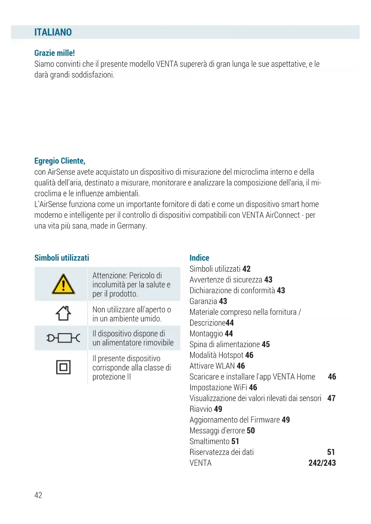 Simboli utilizzati Grazie mille! Siamo convinti che il presente modello VENTA supererà di gran lunga le sue aspettative, e le darà grandi soddisfazioni. Egregio Cliente, con AirSense avete acquistato un dispositivo di misurazione del microclima interno e della qualità dell'aria, destinato a misurare, monitorare e analizzare la composizione dell'aria, il mi- croclima e le influenze ambientali. L'AirSense funziona come un importante fornitore di dati e come un dispositivo smart home moderno e intelligente per il controllo di dispositivi compatibili con VENTA AirConnect - per una vita più sana, made in Germany. Attenzione: Pericolo di incolumità per la salute e per il prodotto. Non utilizzare all'aperto o in un ambiente umido. Il dispositivo dispone di un alimentatore rimovibile Il presente dispositivo corrisponde alla classe di protezione II Indice Simboli utilizzati 42 Avvertenze di sicurezza 43 Dichiarazione di conformità 43 Garanzia 43 Materiale compreso nella fornitura / Descrizione 44 Montaggio 44 Spina di alimentazione 45 Modalità Hotspot 46 Attivare WLAN 46 Scaricare e installare l'app VENTA Home 46 Impostazione WiFi 46 Visualizzazione dei valori rilevati dai sensori 47 Riavvio 49 Aggiornamento del Firmware 49 Messaggi d'errore 50 Smaltimento 51 Riservatezza dei dati 51 VENTA 242/243ITALIANO