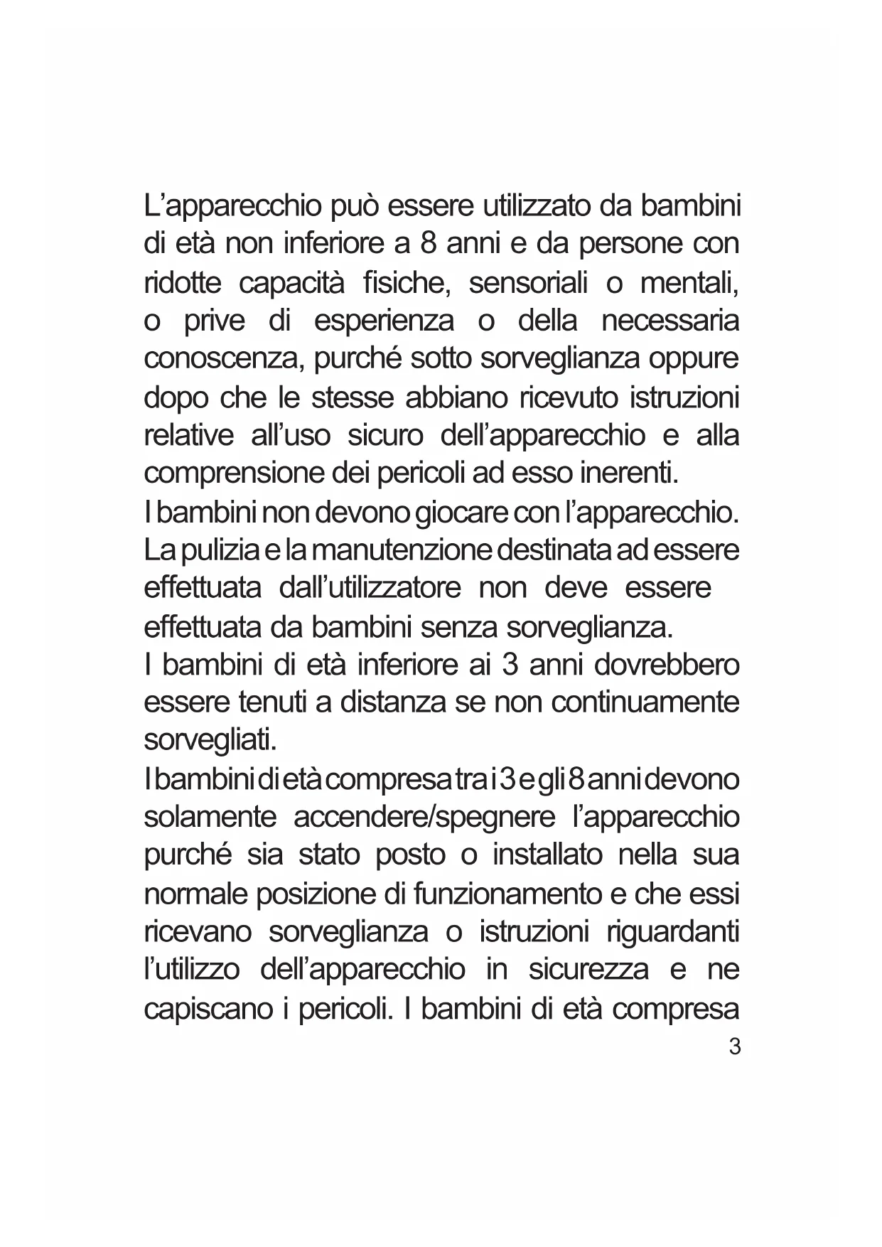 L’apparecchio può essere utilizzato da bambini di età non inferiore a 8 anni e da persone con ridotte capacità siche, sensoriali o mentali, o prive di esperienza o della necessaria conoscenza, purché sotto sorveglianza oppure dopo che le stesse abbiano ricevuto istruzioni relative all’uso sicuro dell’apparecchio e alla comprensione dei pericoli ad esso inerenti. I bambini non devono giocare con l’apparecchio. La pulizia e la manutenzione destinata ad essere eettuata dall’utilizzatore non deve essere eettuata da bambini senza sorveglianza. I bambini di età inferiore ai 3 anni dovrebbero essere tenuti a distanza se non continuamente sorvegliati. I bambini di età compresa tra i 3 e gli 8 anni devono solamente accendere/spegnere l’apparecchio purché sia stato posto o installato nella sua normale posizione di funzionamento e che essi ricevano sorveglianza o istruzioni riguardanti l’utilizzo dell’apparecchio in sicurezza e ne capiscano i pericoli. I bambini di età compresa4 tra i 3 e gli 8 anni non devono inserire la spina, regolare o pulire l’apparecchio né eseguire la manutenzione a cura dell’utilizzatore. ATTENZIONE — Alcune parti del presente prodotto possono diventare molto calde e provocare ustioni. Bisogna prestare particolare attenzione laddove sono presenti bambini e persone vulnerabili. Se il cavo di alimentazione dovesse essere danneggiato, deve essere sostituito solamente presso i centri di assistenza autorizzati dal costruttore in modo da prevenire ogni rischio. ATTENZIONE: Per evitare il surriscaldamento, non coprire l’apparecchio. Non posizionare l’apparecchio immediatamente al di sotto di una presa di corrente. Non utilizzare questo apparecchio nelle immediate vicinanze di una vasca da bagno, di una doccia o di una piscina. NON COPRIRE5 Avvertenze