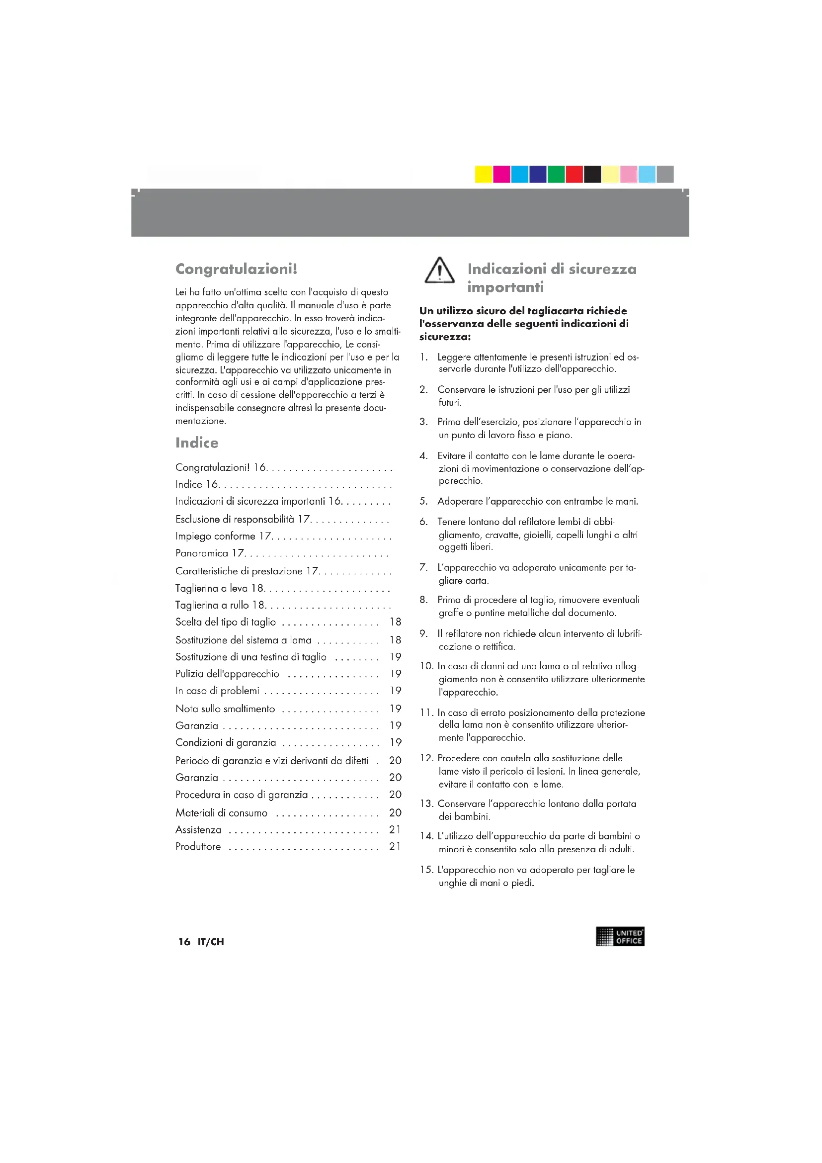 Scarica le istruzioni per il tuo Tagliacarte in formato PDF gratuitamente! Trova il tuo manuale IAN 73837 - UNITED OFFICE e riprendi in mano il tuo dispositivo elettronico. In questa pagina sono pubblicati tutti i documenti necessari per l'utilizzo del tuo dispositivo. IAN 73837 del marchio UNITED OFFICE.