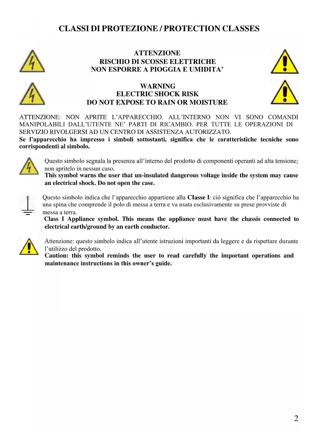 DO NOT EXPOSE TO RAIN OR MOISTURE ATTENZIONE: NON APRITE L’APPARECCHIO. ALL’INTERNO NON VI SONO COMANDI MANIPOLABILI DALL’UTENTE NE’ PARTI DI RICAMBIO. PER TUTTE LE OPERAZIONI DI SERVIZIO RIVOLGERSI AD UN CENTRO DI ASSISTENZA AUTORIZZATO. Se l’apparecchio ha impresso i simboli sottostanti, significa che le caratteristiche tecniche sono corrispondenti al simbolo. Questo simbolo segnala la presenza all’interno del prodotto di componenti operanti ad alta tensione; non apritelo in nessun caso. This symbol warns the user that un-insulated dangerous voltage inside the system may cause an electrical shock. Do not open the case. Questo simbolo indica che l’apparecchio appartiene alla CIasse I: ciò significa che l’apparecchio ha una spina che comprende il polo di messa a terra e va usata esclusivamente su prese provviste di messa a terra. Class I Appliance symbol. This means the appliance must have the chassis connected to electrical earth/ground by an earth conductor. Attenzione: questo simbolo indica all’utente istruzioni importanti da leggere e da rispettare durante l’utilizzo del prodotto. Caution: this symbol reminds the user to read carefully the important operations and maintenance instructions in this owner’s guide.3