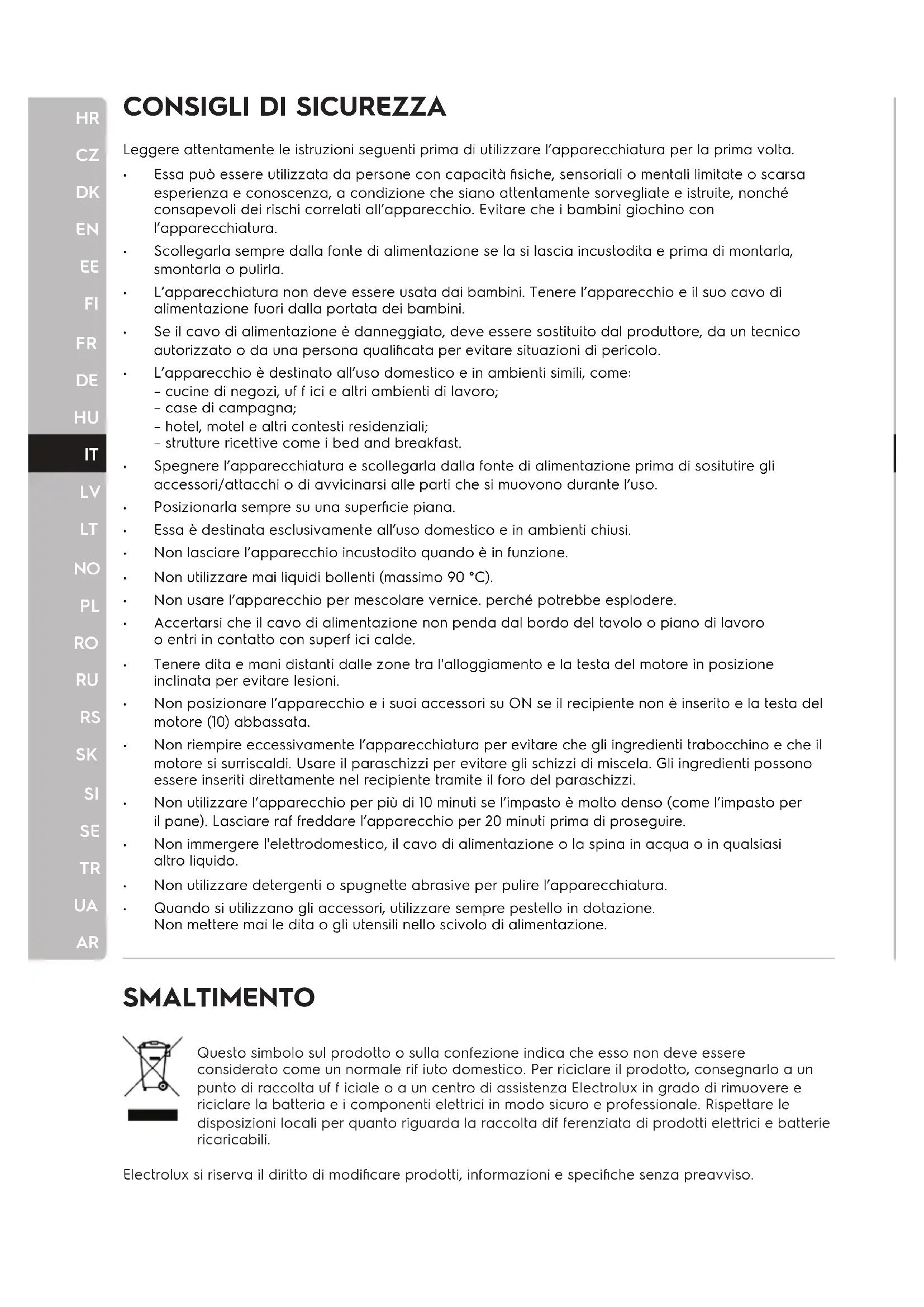 SMALTIMENTO Questo simbolo sul prodotto o sulla confezione indica che esso non deve essere considerato come un normale rif iuto domestico. Per riciclare il prodotto, consegnarlo a un punto di raccolta uf f iciale o a un centro di assistenza Electrolux in grado di rimuovere e riciclare la batteria e i componenti elettrici in modo sicuro e professionale. Rispettare le disposizioni locali per quanto riguarda la raccolta dif ferenziata di prodotti elettrici e batterie ricaricabili. Electrolux si riserva il diritto di modificare prodotti, informazioni e specifiche senza preavviso. Leggere attentamente le istruzioni seguenti prima di utilizzare l’apparecchiatura per la prima volta. Essa può essere utilizzata da persone con capacità fisiche, sensoriali o mentali limitate o scarsa esperienza e conoscenza, a condizione che siano attentamente sorvegliate e istruite, nonché consapevoli dei rischi correlati all’apparecchio. Evitare che i bambini giochino con l’apparecchiatura. Scollegarla sempre dalla fonte di alimentazione se la si lascia incustodita e prima di montarla, smontarla o pulirla. L’apparecchiatura non deve essere usata dai bambini. Tenere l’apparecchio e il suo cavo di alimentazione fuori dalla portata dei bambini. Se il cavo di alimentazione è danneggiato, deve essere sostituito dal produttore, da un tecnico autorizzato o da una persona qualificata per evitare situazioni di pericolo. L’apparecchio è destinato all’uso domestico e in ambienti simili, come: – cucine di negozi, uf f ici e altri ambienti di lavoro; – case di campagna; – hotel, motel e altri contesti residenziali; – strutture ricettive come i bed and breakfast. Spegnere l’apparecchiatura e scollegarla dalla fonte di alimentazione prima di sositutire gli accessori/attacchi o di avvicinarsi alle parti che si muovono durante l’uso. Posizionarla sempre su una superficie piana. Essa è destinata esclusivamente all’uso domestico e in ambienti chiusi. Non lasciare l’apparecchio incustodito quando è in funzione. Non utilizzare mai liquidi bollenti (massimo 90 °C). Non usare l’apparecchio per mescolare vernice. perché potrebbe esplodere. Accertarsi che il cavo di alimentazione non penda dal bordo del tavolo o piano di lavoro o entri in contatto con superf ici calde. Tenere dita e mani distanti dalle zone tra l'alloggiamento e la testa del motore in posizione inclinata per evitare lesioni. Non posizionare l’apparecchio e i suoi accessori su ON se il recipiente non è inserito e la testa del motore (10) abbassata. Non riempire eccessivamente l’apparecchiatura per evitare che gli ingredienti trabocchino e che il motore si surriscaldi. Usare il paraschizzi per evitare gli schizzi di miscela. Gli ingredienti possono essere inseriti direttamente nel recipiente tramite il foro del paraschizzi. Non utilizzare l’apparecchio per più di 10 minuti se l’impasto è molto denso (come l’impasto per il pane). Lasciare raf freddare l’apparecchio per 20 minuti prima di proseguire. Non immergere l'elettrodomestico, il cavo di alimentazione o la spina in acqua o in qualsiasi altro liquido. Non utilizzare detergenti o spugnette abrasive per pulire l’apparecchiatura. Quando si utilizzano gli accessori, utilizzare sempre pestello in dotazione. Non mettere mai le dita o gli utensili nello scivolo di alimentazione.
