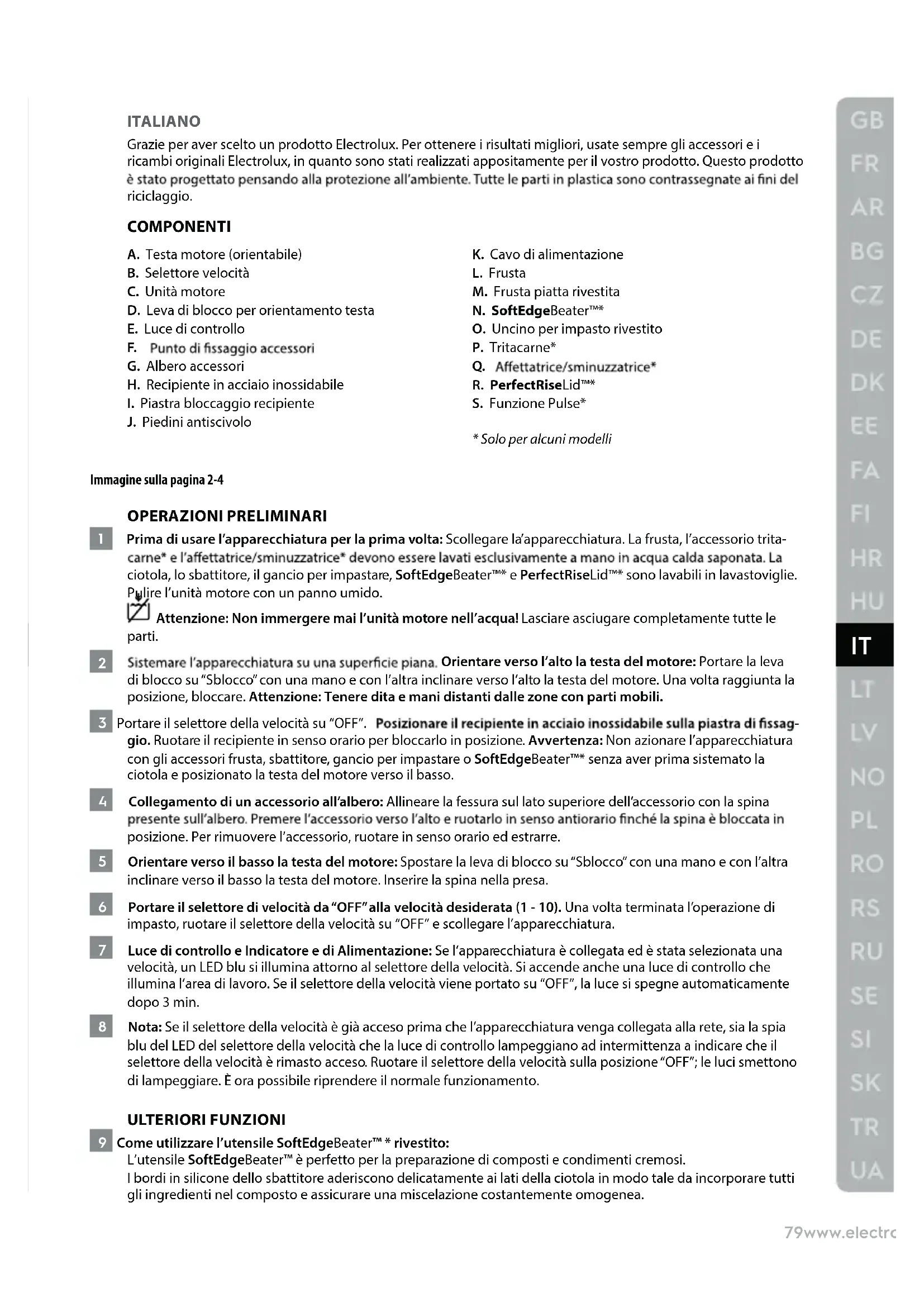 22 Scollegare la spina dalla presa di corrente. - tatutto* a mano, in acqua tiepida saponata. La ciotola, lo sbattitore, il gancio per impastare, SoftEdgeBeater™* e PerfectRiseLid™* sono lavabili in lavastoviglie. Pulire l’unità motore con un panno umido. Attenzione: Non immergere mai l’unità motore nell’acqua! Lasciare asciugare completamente tutte le parti. 23 Non utilizzare detergenti o spugnette abrasivi per pulire l’apparecchiatura. Vi auguriamo di fare buon uso del vostro nuovo elettrodomestico Electrolux!81www.electrolux.com