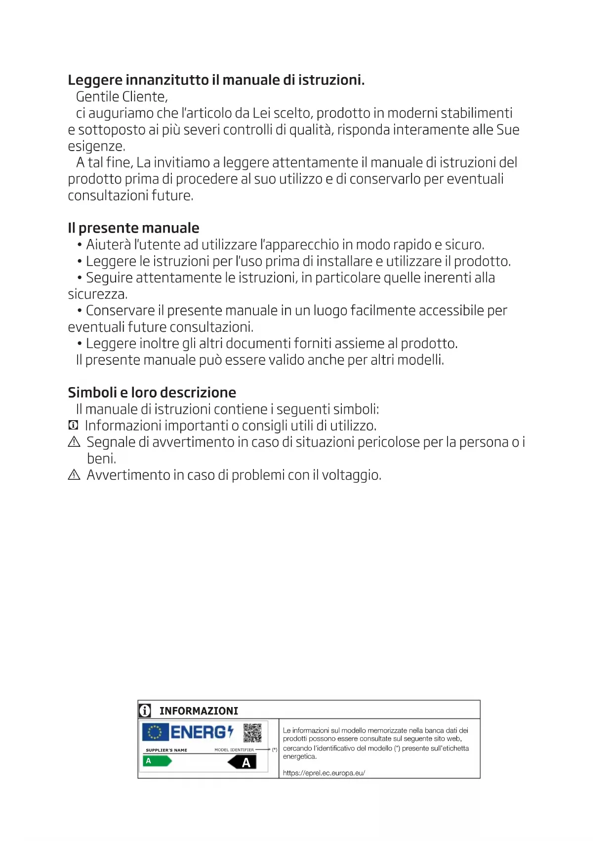 - Conservare il presente manuale in un luogo facilmente accessibile per eventuali future consultazioni.